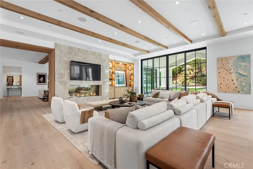 This brand new, recently completed, and absolutely gorgeous estate is nestled on a beautiful, lushly landscaped 1.4 acre lot. This home exemplifies the essence of the relaxed, indoor/outdoor California lifestyle and features luxury, elegance and excellent quality throughout. Bathed in natural light, and spanning 16,215' (including the 931' guest house), the spacious, open floor plan is highlighted by a restaurant quality chefs kitchen with two islands, one with countertop seating, plus a big breakfast room, all opening to the large family room with sliding walls of glass, two-sided fireplace & adjoining lounge/game room with wet bar. Additional amenities include a spacious formal dining room with refrigerated wine wall, adjoining butler's pantry, large private office with built-in custom cabinetry, stunning home theater with fabric covered acoustic sound walls, and a big gym & spa complete with steam shower, sauna, and sliding walls of glass opening to the rear grounds. There are six generous en suite bedrooms, four upstairs and two on the main floor. The superb primary suite includes a retreat, fireplace, deluxe bath with dual showers, big soaking tub, enormous, room sized custom closets, and a large private balcony overlooking the large backyard. The spacious grounds include a picturesque guest house, sparkling pool with large Baja shelf, family size spa, large covered patio, full barbecue center, a firepit with seating area, expansive grass lawns, mature trees, a circular driveway, and garages for four cars with gleaming epoxy floors. The home is also located on one of H