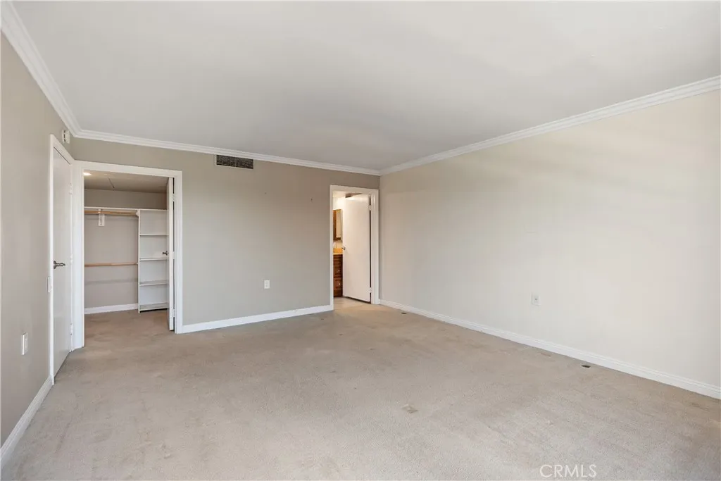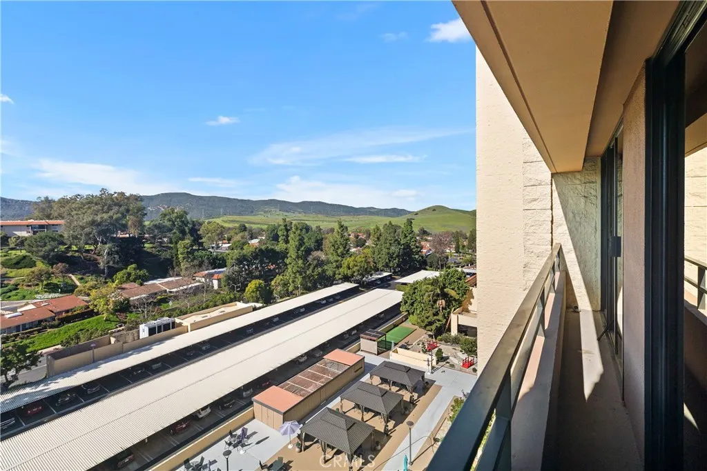 Immaculate and move-in-ready End unit condo in the Laguna Woods Towers with panoramic hill and neighborhood views. Updated home is light and bright. This 2-bedroom, 2-bathroom unit offers a spacious living and dining area with floor to ceiling sliding doors that open to a long, covered Juliet style balcony, perfect for enjoying fresh air and the scenery. The open kitchen features abundant wood cabinetry, granite counters, a breakfast bar peninsula, built in wine rack, and recessed lighting. The primary suite enjoys the views and includes a walk-in closet with built-in shelving and a private bathroom with updated granite vanity. The second bedroom also has slider access that opens to the balcony and includes a full wall built-in desk and cabinetry, ideal for a home office, hobby room, or guest space. There is a guest bathroom with step in shower and grab bars. Crown molding, smooth ceilings, Engineered wood flooring in the main living areas, and abundant storage complete the home. The Towers monthly assessment includes a $500 monthly dining credit for meals in the Crystal Dining Room or Cafe Latitude 50, housekeeping visits every two weeks, utilities, cable TV, free laundry facilities, 24-hour desk services, 24-hour onsite maintenance, and many activities, along with shared outdoor patios. Shuttle bus service arrives at the front door and can take you throughout the community and local shopping. As a Laguna Woods Village resident you will also be able to enjoy activities at 7 clubhouses, 5 swimming pools, private community golf courses (27 hole championship course and 9-hole