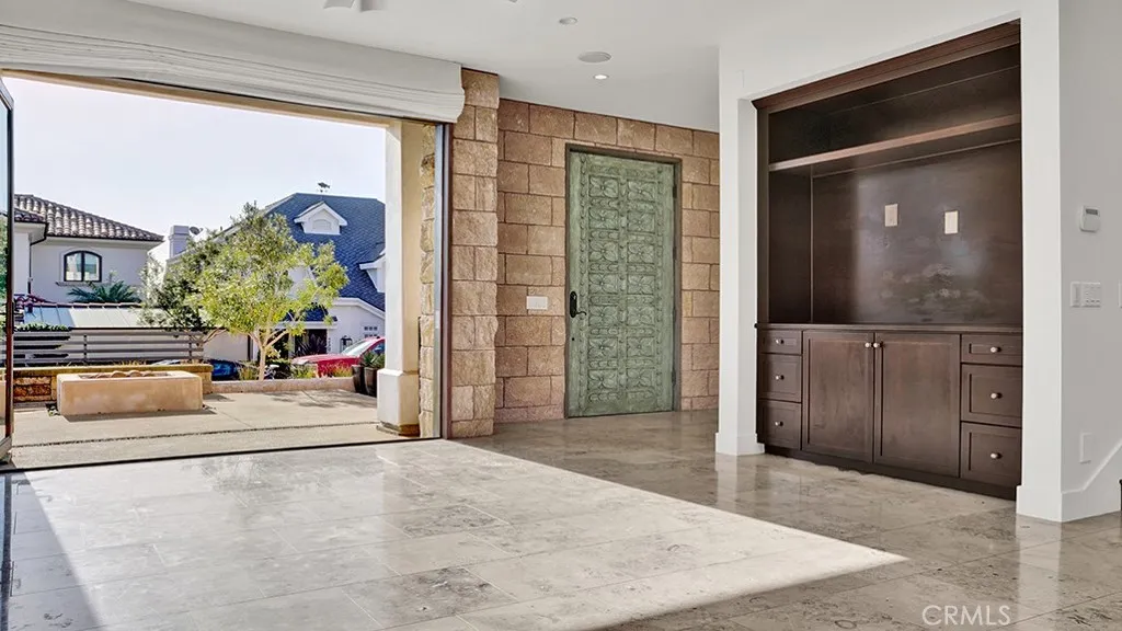 Coveted corner positioning just moments from Little Corona Beach defines this custom coastal residence offering four bedrooms and three-and-one-half baths across approximately 3,004 square feet. Soft Mediterranean architecture merges with refined transitional interiors, creating a home that feels both timeless and distinctly coastal. An inviting front patio with built-in seating and fire feature sets an elegant tone before entry. Hand-carved wood doors open to a dramatic great room framed by textured limestone, curated natural finishes, and abundant light. Expansive sliding glass panels dissolve the boundary between interior living and ocean air, creating effortless continuity across living, dining, and kitchen spaces. Designed for elevated everyday living, the kitchen centers around an oversized cement-topped island with generous preparation space, premium integrated appliances, a full-size wine refrigerator, and a professional-grade range complemented by a pot filler for added convenience. Primary suite offers a private coastal sanctuary with ocean views, fireplace, and a spa-caliber bath appointed with soaking tub, steam shower, and dual vanities. Rear patio extends the living experience with a statement fireplace and tranquil water wall feature, creating a serene backdrop for evening gatherings. Above, a rooftop deck captures sweeping Pacific vistas and cinematic sunsets, offering a rare vantage point above the Village. Additional enhancements include dual Gen 4 Nest Pro thermostats and a dedicated mini-split system within the primary suite for refined climate control.
