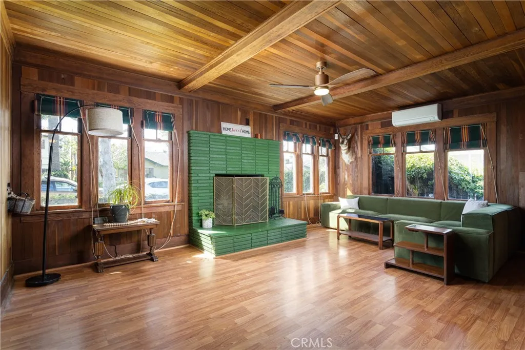 Wood shingled Craftsman Bungalow located on a corner lot in the historic district of Rose Park South. This bungalow is a few blocks to Retro Row restaurants and, and a 10 minute walk to the beach. A large fenced front yard with grass and citrus trees welcome you as you walk up to the house. Fun fact: several cacti and succulents came from Leonardo DiCaprios property! There is a large front porch with the original oak front door to the living room, and French doors to the dining room. The open living room and dining room feature natural wood paneling on the walls and ceilings. There is a wood burning fireplace, custom Roman blinds, and ceiling fans. The dining room features the original buffet cabinetry, and a custom swinging door with stained glass to the hallway. There is an abundance of natural light from the original wood framed windows. The kitchen has vintage wood cabinetry, and tile countertops. There is an abundance of storage space in the kitchen. The laundry room is adjacent. There is a screened back porch as well. There are 2 bedrooms total, with a larger closet in the hall between them. The first bedroom has a door to the living room. The 2nd bedroom features a custom desk area, closet cabinetry and a bookcase, along with a door to the backyard. There is a 3/4 bathroom with custom stained glass windows, tiled shower and a custom vanity. The house also has a split HVAC system and ceiling fans. *There is an ADT Alarm System, Ring doorbell, and cameras.* The bedrooms and living room have updated electrical outlets and Romex wiring. The hallway also has a pull-down a