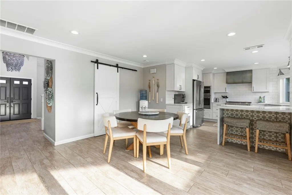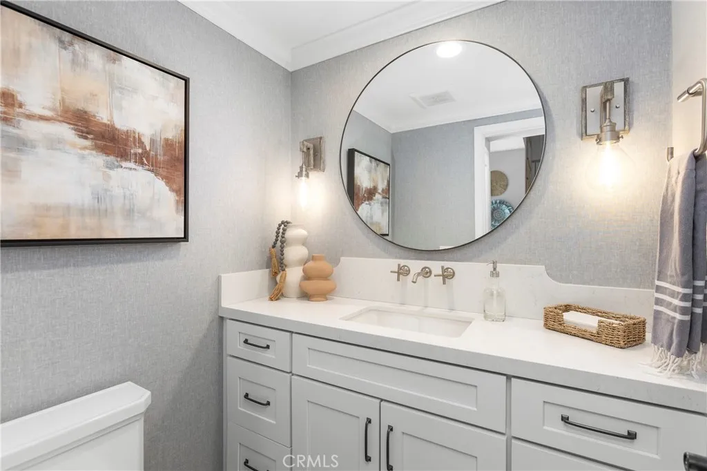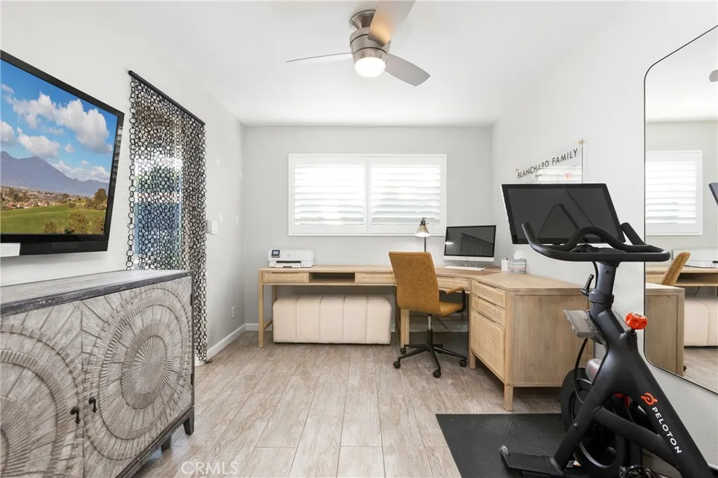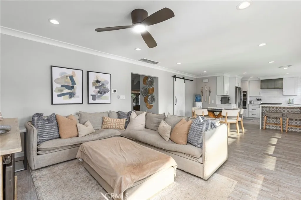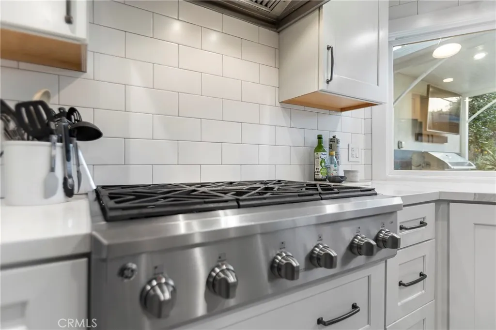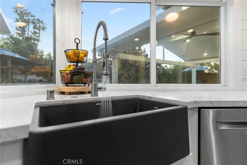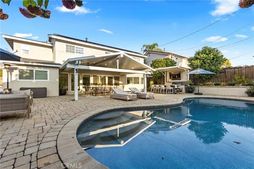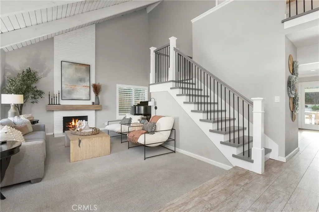 Extensively upgraded & move-in ready home with incredible yard. This beautifully designed home features a new roof (2015), full repipe, complete electrical rewire (2017), Milgard windows and doors, & solar panels with new electrical panel. The living room showcases a vaulted wood-paneled ceiling, designer Palecek beaded chandelier & a white brick fireplace with custom wood mantel. Updated white oak stairs with iron spindles. The remodeled kitchen offers white shaker cabinetry, quartz countertops with waterfall peninsula, a 36 GE gas range with custom zinc hood, Hudson Valley wall sconces, & a walk-in pantry plus an additional barn-door pantry for exceptional storage. The dining room includes a built-in dry bar with wine fridge, & Jeffrey Court backsplash. Additional living spaces include a downstairs flex room ideal for an office, gym, or playroom, and a spacious interior laundry room with extensive custom cabinetry, built-in bench with hooks, & quartz folding counters. The epoxy garage offers built-in storage cabinets. Upstairs features Coretec luxury vinyl plank flooring. The primary suite includes a private balcony with views of multiple fireworks displays, a remodeled bedroom with a custom California Closets walk-in closet. The primary bathroom, remodeled in 2023, showcases white shaker cabinetry, leathered quartz waterfall countertops, brass arched mirrors with Hudson Valley sconces, a large Calacatta tile shower with bench seating, and a private water closet with built-in storage. Secondary bedrooms feature California Closets organizers and ceiling fans, and the secon