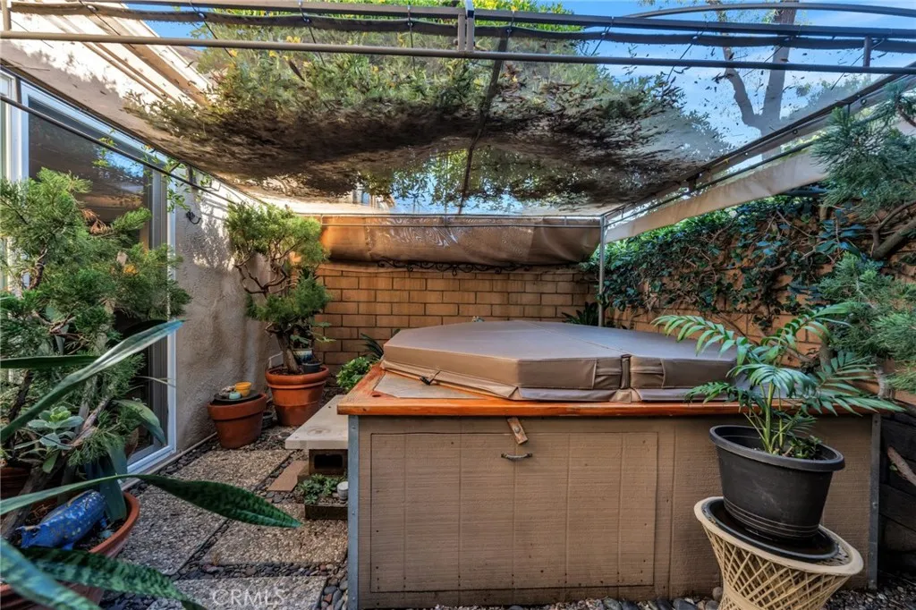 Tucked away at the end of a quiet street in Aegean Heights, this distinct single-level end unit is enveloped by landscaped gardens and serene grassy hillsides, offering privacy and natural beauty. At the heart of the home is a stunning atriuma true sanctuaryfeaturing a complete pond ecosystem with circulating pump, waterfall, lush plantings, and an automatic timer. Screened doors allow you to keep the atrium open year-round for the ultimate indoor-outdoor experience, with direct access from both the entryway and guest bedroom. The dining room and kitchen feature lush views of a garden, lawn area and hillside, while the remodeled 2020 kitchen impresses with soft-close cabinetry, pull-outs, deep storage, granite countertops, stainless steel appliances, and under-cabinet lighting. The tasteful fireplace remodel and smart, adjustable lighting elevate the living areas, complemented by sensible flooring for the active lifestyle. The primary suite delivers new carpet, keyless entry, and direct access to the private back courtyard with hot tub. The newly carpeted guest bedroom includes atrium access to soothe the soul. Home systems that are synced to Kasa app integration include lighting, garage door, alarm, and cameras, plus ceiling fans, attic fans, and A/C for year-round comfort. The third bedroom currently serves as an office with direct access to the garage. Should you choose to wall off the garage access in the third bedroom, there is an additional door to the garage near the entrance. The oversized garage includes extensive built-in storage, a deep workshop area, and a spaci