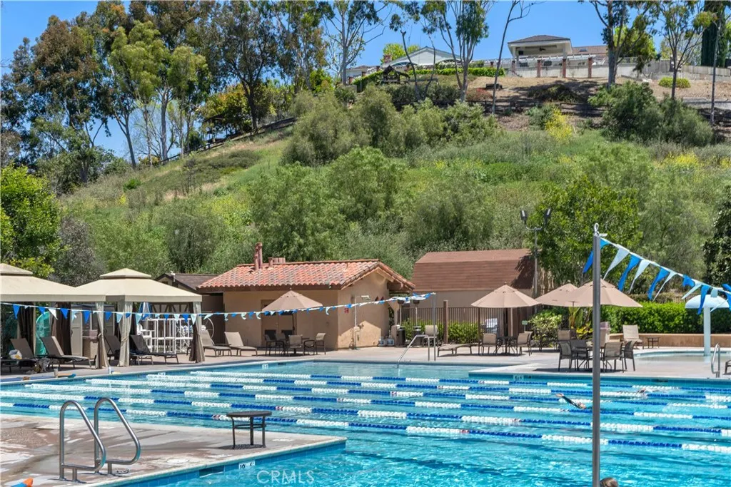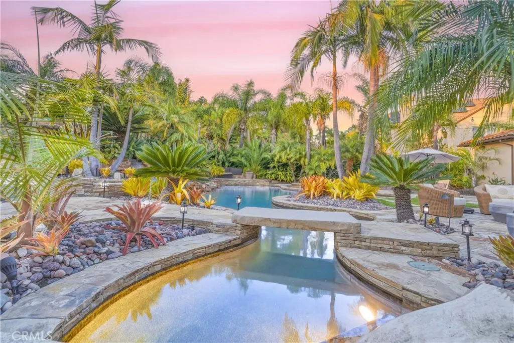 Tucked at the end of a cul-de-sac within a cul-de-sac in prestigious Nellie Gail Ranch, this private estate sits on over half an acre of usable land and offers over 6,200 square feet of living space designed for grand-scale living and unforgettable entertaining. Approaching the home, lush landscaping and mature palms create a sense of arrival, while the quiet interior location provides exceptional privacy rarely found in the neighborhood. Inside, the home unfolds around a beautiful interior courtyard with a fountain, bringing light and tranquility into the heart of the residence. The floorplan offers a rare combination of scale and flexibility, including six bedrooms plus a dedicated office, expansive formal living and dining spaces, and a large family room designed for gathering and entertaining. The chefs kitchen is the centerpiece of the home, featuring abundant cabinetry, a large center island, and an oversized eat-in area. Uniquely, the kitchen also includes a basement level, offering exceptional storage and versatility rarely seen in Southern California homes. The primary suite is a private retreat with its own fireplace, sitting area, private balcony, and a spa-inspired bathroom with dual vanities, soaking tub, and expansive closets. Step outside and the property transforms into a true resort-style sanctuary. The backyard represents over $1 million in custom stone hardscape and landscaping, featuring a PebbleTec pool and spa with cascading waterfalls and waterslide and multiple outdoor entertaining areas that allow for large gatherings, making the property ideal for