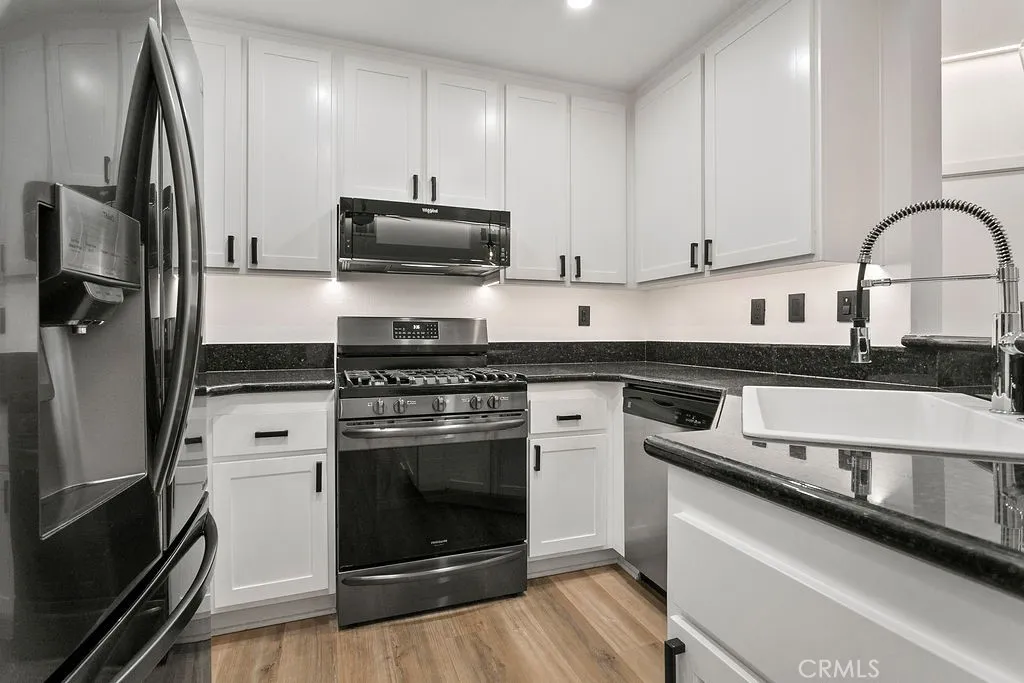 Available NOW! Luxuriously upgraded single-level Milano condo in the heart of Rancho Niguel, offering true step-free living and an exceptional walkable lifestyle. Ideally located just moments from upscale shopping, dining, movie theaters, Life Time fitness, top-rated schools, and convenient toll road and freeway access. This beautifully reimagined residence features a thoughtfully designed floor plan with a spacious, light-filled living area that opens seamlessly to a private enclosed patio through sliding glass doors, creating an inviting indoor-outdoor living experience. The patio includes a dedicated storage closet for added functionality. The kitchen is a standout, showcasing gorgeous white shaker cabinetry with integrated accent lighting, sleek countertops, and updated fixtures with newer stainless-steel appliances, including a refrigerator, gas stove, microwave and dishwasher. A separate dining area sits just beyond the kitchen and is open to the living room providing modern open-concept living. Throughout the home, natural-tone luxury vinyl plank flooring, fresh white paint, and all-new doors and trim create a cohesive modern aesthetic, while striking black accents provide a sophisticated contrast. A focus on comfort and high design is evident in the lighting plan. The main areas feature stunning soft halo ambient lighting surrounding the ceilings, creating a warm, welcoming glow. All bedrooms include modern recessed lights, and the entire lighting system is fully dimmable for customized illumination from bright task work to cozy relaxation. The expansive primary sui