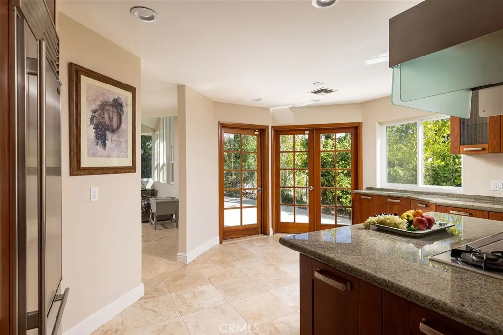 Newly-remodeled, Nellie Gail Ranch view home with private outdoor living. Enjoy sweeping mountain vistas from this three-level residence with rooftop deck, set on roughly 1/4 acre of flat, usable land. A generous driveway leads to a large 3-car garage and manicured landscaping, making for a welcoming curb appeal. Inside, double entry doors open to grand interior proportions with vaulted ceilings and abundant natural light. The living room has dramatic two-story ceilings and a gas fireplace, and the dining area connects to the inviting patio through double French doors. The chefs kitchen is equipped with Thermador double ovens, a SubZero refrigerator, granite countertops, island, and pantry storage. The generous family room features a second gas fireplace, large windows, and direct access to the backyard, continuing the home's indoor-outdoor design. Fresh paint, travertine flooring, convenient powder room, downstairs office, and designated laundry room with sliding barn door complete the main floor. With six total bedrooms and four full baths, the upgraded home comfortably accommodates family and guests. On the top level, you will find the expansive and private primary suite surrounded by spectacular views and has private access to a large balcony. The primary bath has a chic soaking tub, double vanity, shower, and a spacious walk-in closet with natural light. The private pool-size backyard includes a patio and lawn surrounded by lush, mature landscaping with Italian cypress and palm trees. Exterior stairs provide direct access to the upper floors, and the rooftop deck deliv