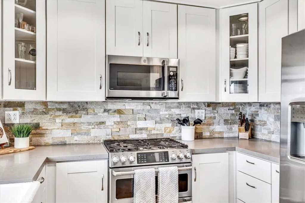 Stunning View Home in Aliso Viejo, showcasing fantastic curb appeal, refined interior finishes, and thoughtful upgrades. This beautifully maintained Four Bedroom home is ideally located in the desirable Glenwood Terrace communitywalkable to parks, the neighborhood pool, and lighted tennis courts. Designed with an excellent floor plan, the home features a main-level bedroom and full bathroom, ideal for guests or multigenerational living. A welcoming entry opens to the light-filled living room with vaulted ceilings, upgraded vinyl windows, and plantation shutters. The formal dining room flows seamlessly to a private side-yard retreat, creating an inviting additional outdoor living space. The completely remodeled kitchen offers timeless style with quartz countertops, stone backsplash, white shaker cabinetry, GE stainless steel appliances, an oversized farmhouse sink, and a charming garden window overlooking the backyard. A casual dining area opens to the family room with a gas log fireplace. Extensive home upgrades include a newer roof, whole-house PEX repipe, owned solar, upgraded HVAC, newer water heater, and remodeled bathrooms. Upstairs, three bedrooms enjoy east-facing views of the Saddleback Mountains. The primary suite features vaulted ceilings, two separate closets and an updated en-suite bathroom with granite countertops and dual sinks. The oversized balcony is perfect for enjoying colorful sunrises, sparkling city lights, and 4th of July fireworks. Artistically designed landscaping creates a serene front and backyard oasis with multiple patios, drip irrigation, exter