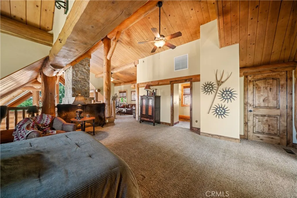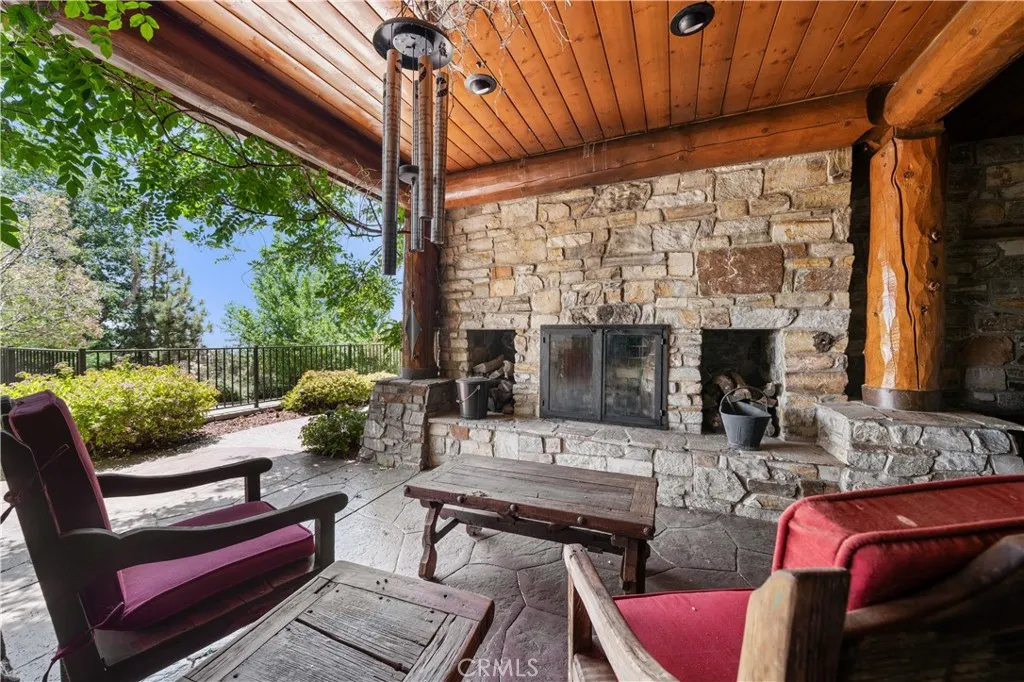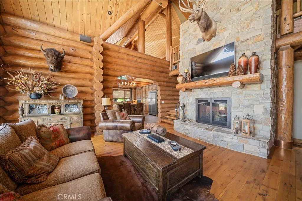 Unveil this exquisite 4-bed, 3.5 bath custom log home by Caribou Creek, boasting 3,717 sq ft across 3.63 acres. Crafted in Swedish Cope style with premium Western White Pine, this sanctuary combines exceptional artistry with rustic luxury within the prestigious gated Bear Valley Springs community. Upper Level loft: Generous bedroom with ensuite bath, walk-in closet, and a balcony with a beautiful view. Ideal for guests, home office, or a serene escape. Main Level: Luxurious primary suite featuring a stone fireplace, spa inspired jacuzzi tub, radiant heated floors, dual vanities, walk-in closet, and a private balcony with mountain views; expansive living area with soaring ceilings and a Mcgregor Lake Ledge stone fireplace; gourmet kitchen equipped with Viking appliances, reverse osmosis, triple thick leathered granite counters, custom alder/hickory cabinets, and an integrated BBQ station. Lower Level: Two additional bedrooms (one with built in bunk beds), a full bathroom, laundry closet with side by side washer/dryer, a game room with wet bar (copper sink, beverage fridge, cigar rack) plus a dedicated theater room with motorized screen and media center. Outdoor Oasis: Vast natural stone decks with propane BBQ, sink, fire pit areas, horseshoe pit, and multiple seating spots; secluded, tree lined acreage with sweeping views and outdoor gathering spaces. Added benefits: Finished garage with storage, dual zone HVAC, custom motorized gate, whole house fan, large water heater and water softener. Community Highlights: Relish exclusive access to an equestrian center, scenic riding t