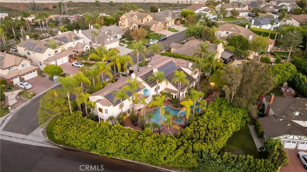Escape to your own private oasis in the heart of Nellie Gail Ranch. Set on a flat, tranquil corner lot, featuring 8 bedrooms and 11 bathrooms, within a generous 7,372 square foot floor plan, this entertainers estate seamlessly blends indoor luxury with resort-style outdoor amenities. Recent upgrades include new windows throughout, whole house PEX repipe, owned solar system, whole house water filtration system, whole house water softener, Vivint security system, and epoxy floors in the 3-car garage. The entry courtyard enchants with custom fountains, a koi pond, and double entry doors. Inside, a grand foyer with a wrought-iron adorned spiral staircase welcomes you. The light-filled living and dining area boasts vaulted ceilings, hardwood floors, and a fireplace, adjacent to your two main-floor ensuite bedrooms. A gourmet kitchen awaits with double ovens and dishwashers, a 6-burner cooktop, and an eat-in dining space open to the comfortable family room and bar. An expansive game room features a pub-style bar, private bathroom, billiards table and games, and direct access to the inviting pool area. Upstairs, retire to your palatial primary suite with a double-sided fireplace retreat, primary bath with jacuzzi tub, and walk-in closet. Private quarters on this level include 3 more fully en-suite bedrooms, 2 jack-and-jill suites, and an oversized office/bonus room with built-ins. Outdoors, experience the winding saltwater pool and spa with its upgraded grotto, Baja deck, and mosaic tile, all solar-heated and controlled via the Pentair smart app. The exterior also features firepla