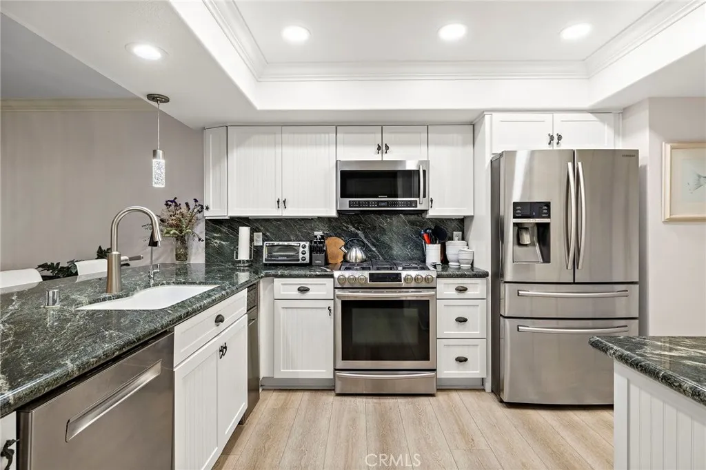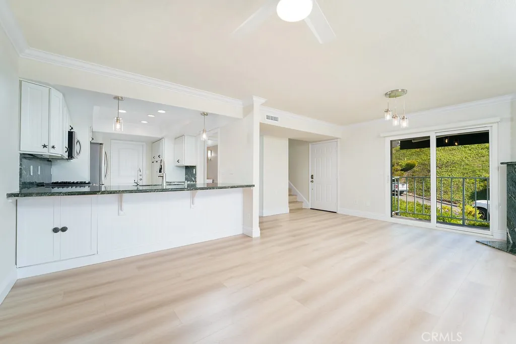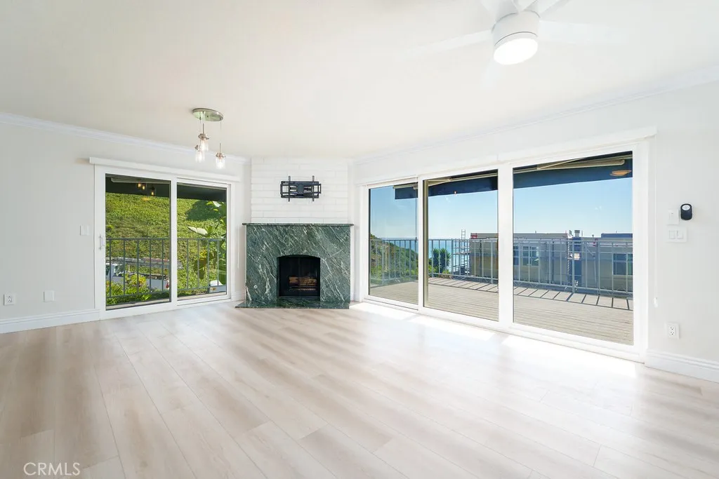 Experience coastal living at its finest in this beautifully located corner-unit townhome within the highly desirable Dana Bluffs community. Enjoy sweeping views of the Pacific Ocean, Dana Point Harbor, Doheny Beach, and Catalina Island from this exceptional residence designed to capture the beauty of its surroundings. Recently refreshed with crisp white paint throughout, the home features a bright and open floor plan that connects the living room, dining area, and kitchen, creating a comfortable and inviting living space. The living room showcases a custom granite fireplace that serves as a stylish focal point, while the dining area offers the perfect setting for everyday meals or entertaining guests. The kitchen is thoughtfully designed with stainless steel appliances, Kraftmaid cabinetry, and custom granite countertops that complement the elegant finishes throughout the home. Durable luxury vinyl flooring runs throughout the residence, adding both sophistication and practicality. A beautiful etched glass window featuring wave designs highlights the stair landing, adding a subtle coastal touch to the homes character. Upstairs you will find two spacious primary suites, each offering generous mirrored closets and private en-suite bathrooms. The main primary suite opens to a private ocean-view deck complete with an electric awningan ideal place to relax while enjoying ocean breezes and sunset views. Additional conveniences include an attached two-car garage with built-in storage cabinets, a freshly epoxy-coated floor, new water heater, and an in-unit washer and dryer. Residen