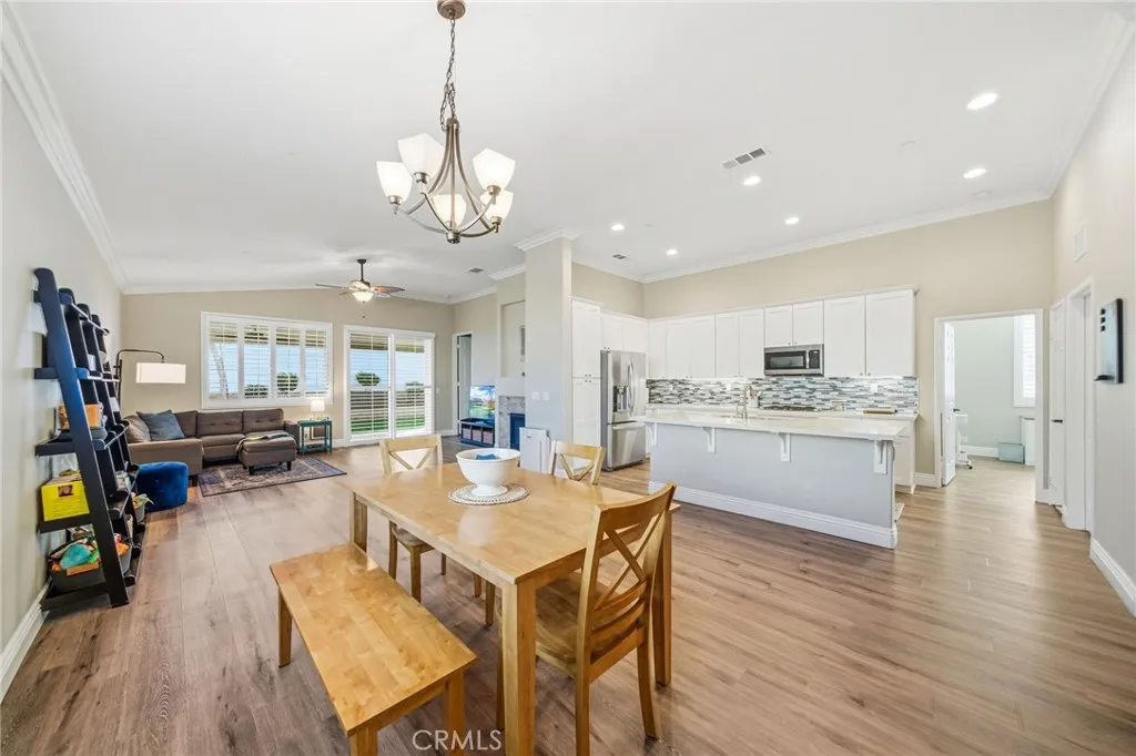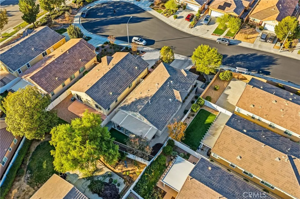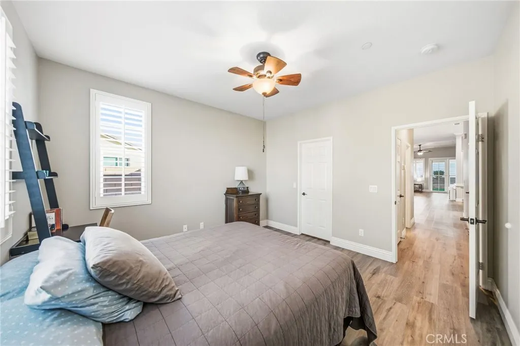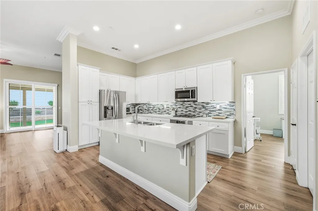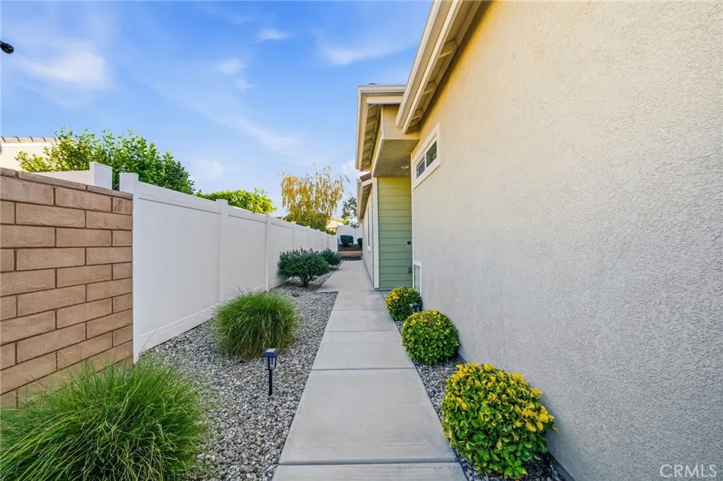 Welcome to this turnkey residence on a prime cul-de-sac location! 26535 Rim Creek Pathway is a truly gorgeous 3-bedroom, 2-bathroom single-family home located on a prime cul-de-sac in a desirable 55+ Menifee community. This home is packed with high-end upgrades, making it fully turnkey. Interior features include vinyl flooring throughout, shutters on all windows, crown molding, upgraded baseboards, and ceiling fans in every room. The kitchen and bathrooms boast quartz countertops and soft-closing drawers. Kitchen also includes a custom backsplash, stainless steel appliances, and pull-out lower shelves in the kitchen/pantry. The third bedroom features built-in desk and cabinets. When it comes to utility and efficiency, it is equipped with a Tankless Water Heater and a Quiet Cool Whole House Fan. The inside laundry room includes a sink for your convenience. Outside is a backyard featuring an Alumawood patio cover with ceiling fans and gutters. HOA amenities include a Swimming Pool, Spa, Exercise Room, BBQ area, and Tennis/Pickleball Court. Conveniently located near schools, shopping, and commuter access, this home truly represents the pinnacle of upgraded, comfortable living in a prime Menifee 55+ location. This is the complete package. Don't let this opportunity to secure your fully upgraded dream home pass you by! Schedule your showing today!