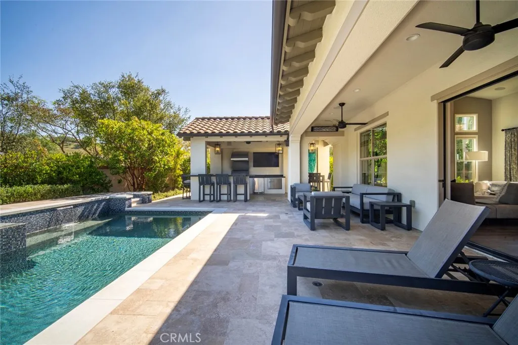 A rare single-story offering built in 2018 and available for the first time in one of San Juan Capistranos most private gated communities. Located at the end of a quiet cul-de-sac within Pacifica San Juan, this exceptional residence offers refined coastal living with privacy, comfort, and resort-style amenities. With just 22 homes on Tranquila, the setting feels serene and exclusive, surrounded by tree-lined streets and coastal breezes just minutes from Dana Point Harbor, Doheny Beach, and downtown San Juan Capistrano. From the front yard, a peek-a-boo ocean view offers a subtle reminder of the homes proximity to the coast. Designed for effortless indoor-outdoor living, La Cantina doors open to a private backyard retreat anchored by a saltwater pool and spa, firepit, mature low-maintenance landscaping, and a custom California Room complete with an outdoor kitchen, bar seating, heaters, and TV creating an extension of the living space and an ideal setting for year-round entertaining. A putting green adds a playful finishing touch. Inside, the open-concept floor plan is filled with natural light, soaring ceilings, and sophisticated finishes. The chefs kitchen features Sub-Zero and Monogram appliances, quartz countertops and backsplash, custom cabinetry, and a built-in bar with dual wine refrigerators. The family room is centered around a custom fireplace controlled by the touch of a remote. The thoughtfully designed single-level layout offers four ensuite bedrooms, including a front bedroom with private entrance ideal for a home office or guest suite. The primary suite is a p