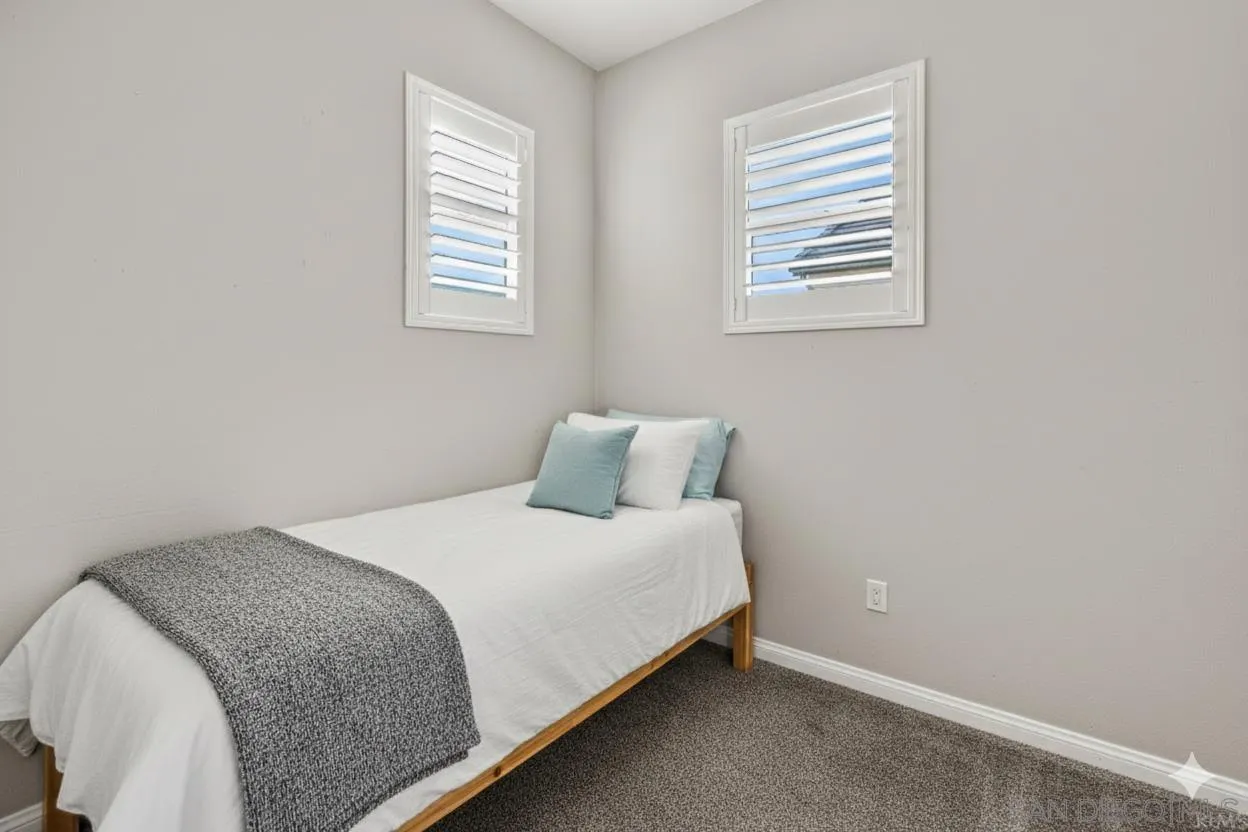 Welcome to this charming and highly upgraded residence in the desirable Harmony Grove Village, perfectly designed for modern living. The heart of the home is a chef-inspired kitchen featuring quartz counters, abundant cabinet and counter space, and a huge central island with comfortable bar seating, seamlessly opening to a sun-drenched, large great room boasting vaulted ceilings and fantastic natural light. The main living areas showcase beautiful hardwood flooring, adding warmth and elegance throughout. Practicality meets convenience with a desirable downstairs bedroom and full bath, ideal for guests or multi-generational living. Upstairs, the oversized master suite provides a serene retreat, complete with an en suite bathroom featuring his-and-hers sinks, a spacious step-in shower, and a private commode area. A major highlight is the functional loft area that has been thoughtfully finished to create a small additional room, offering flexibility as a potential fourth bedroom, home office, or gym. The home is future-ready and energy-efficient, equipped with a solar system and a Tesla Powerwall battery. Further amenities include an upstairs laundry room and an attached two-car garage. The fenced backyard is a true low-maintenance oasis, designed for outdoor enjoyment with a fantastic hangout area featuring a firepit and pavers, alongside a pet and kid-friendly turf area. Living in Harmony Grove Village grants access to exceptional community amenities, including multiple parks, a heated community pool, a dog park, and an extensive network of walking and hiking trails.