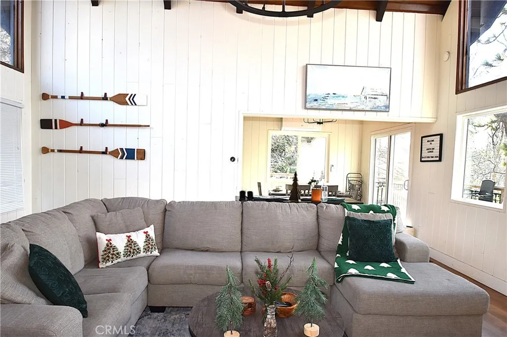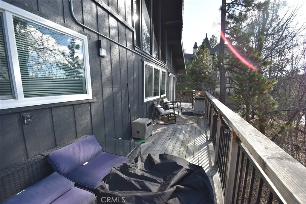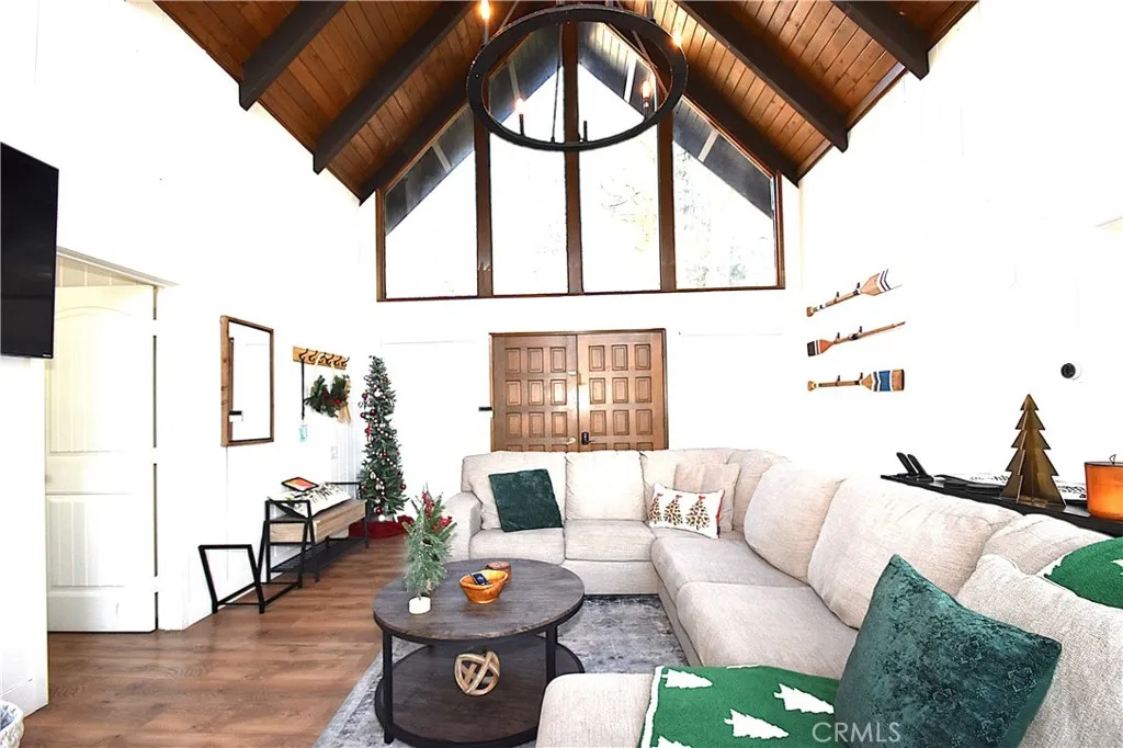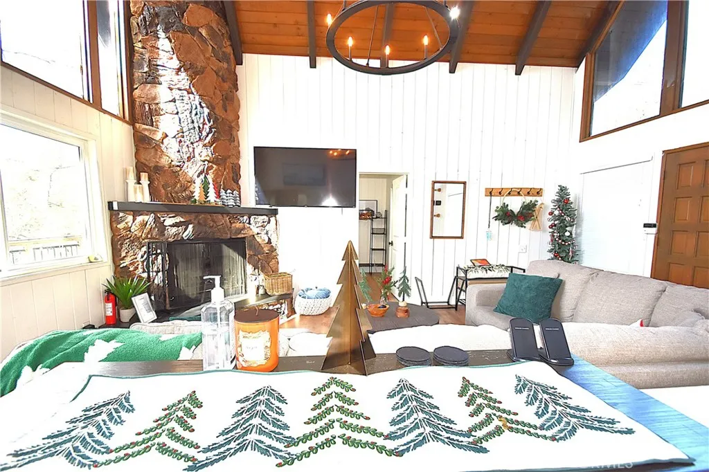 Nestled in the serene mountains near Lake Arrowhead, this charming three-bedroom, two-bath home offers the perfect blend of comfort and nature. Surrounded by towering pines and crisp mountain air, the property features an inviting open-concept living area with vaulted ceilings, a cozy stone fireplace, and large windows that fill the space with natural light. The updated kitchen boasts modern appliances and ample counter space, ideal for family meals or entertaining guests. Step out onto the spacious deck to enjoy peaceful forest views and the sounds of nature. The primary suite provides a private retreat with its own bath, while two additional bedrooms offer plenty of room for family or visitors. Just minutes from Lake Arrowhead Village, hiking trails, and year-round outdoor activities, this home is an idyllic home or full-time residence. Home to enjoy a peaceful stay. Water Rights included to Lake.