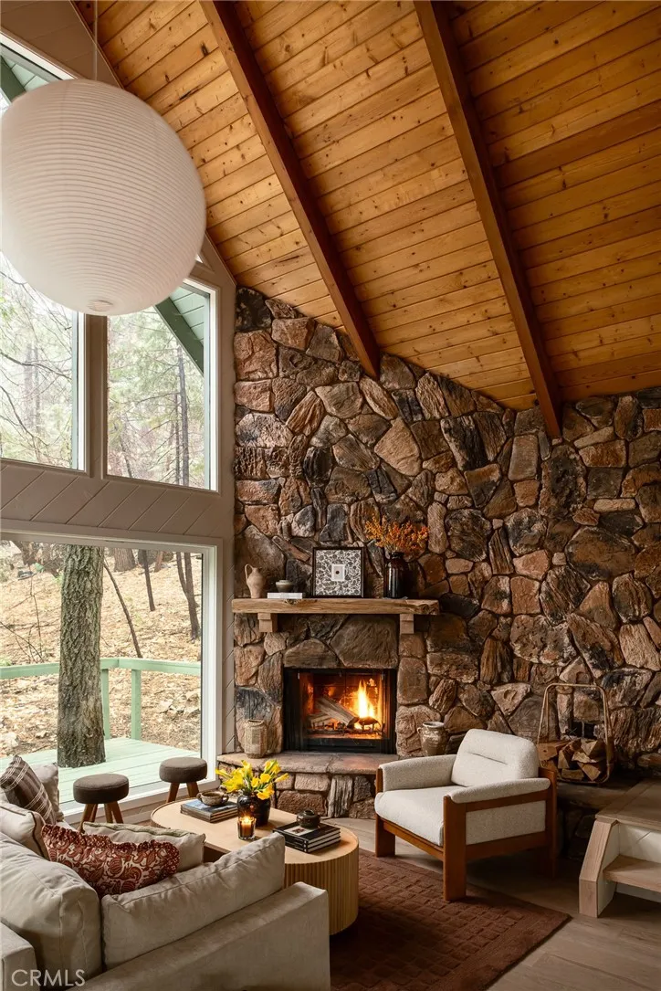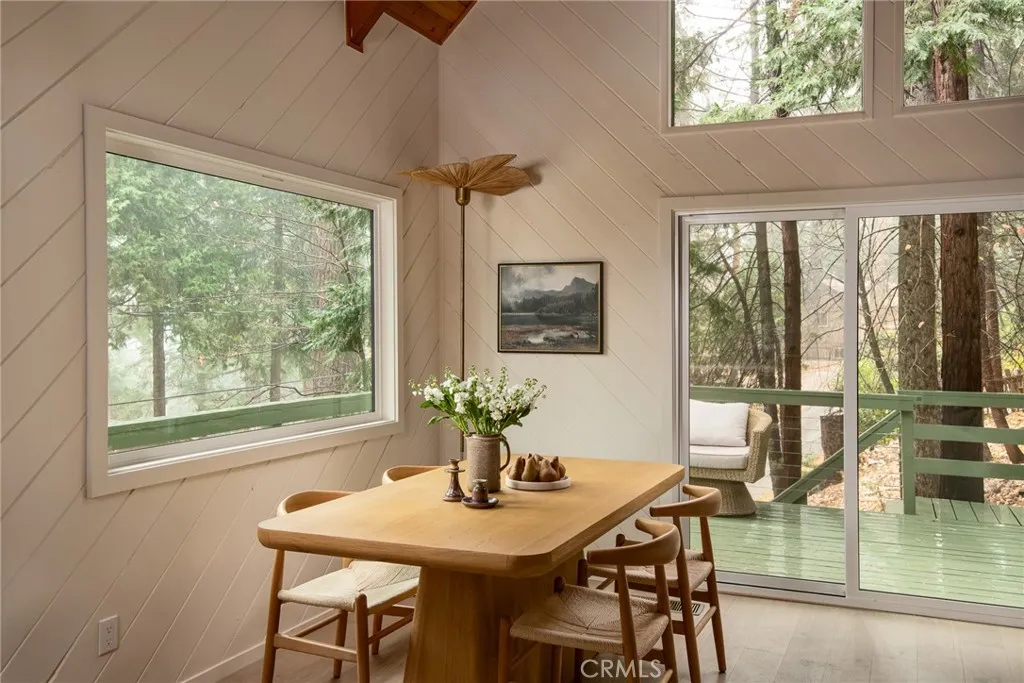 A Japandi-inspired mid-century retreat tucked on a peaceful cul-de-sac in Lake Arrowhead and surrounded by tall pine trees. This thoughtfully renovated cabin blends warm natural textures with clean lines, wood details give the home a calm feel throughout; just minutes from hiking trails, local shops, and mountain restaurants. Inside, the main level opens to a bright, airy living room with floor-to-ceiling windows and stunning forest views. The post-and-beam vaulted ceiling paired with the original stone fireplace brings timeless mid-century character. The newly upgraded deck extends the living area outdoorsperfect for morning coffee or relaxing in the fresh mountain air. The custom kitchen is thoughtfully designed with rift-sawn white oak cabinetry, Calacatta Oro marble countertops and backsplash, open shelving, and Italian appliances. The layout creates a warm, functional space ideal for cooking and hosting. A bedroom sits near the kitchen, along with a beautifully finished bathroom featuring a Calacatta Arabescato marble-wrapped bathtub, handmade Moroccan tile, and a custom oak vanity with a fully integrated marble sink. A handcrafted oak staircase, built by an experienced carpenter leads to the upper level, where the primary suite offers treetop views and peaceful privacy. The spacious room fits a king bed with extra space for a twin, making it ideal for families. The ensuite bathroom includes marble flooring, plaster-finished walls, and a custom oak vanity. The property is surrounded by nature, multiple outdoor seating areas, and wall of glass that invite the lighting i