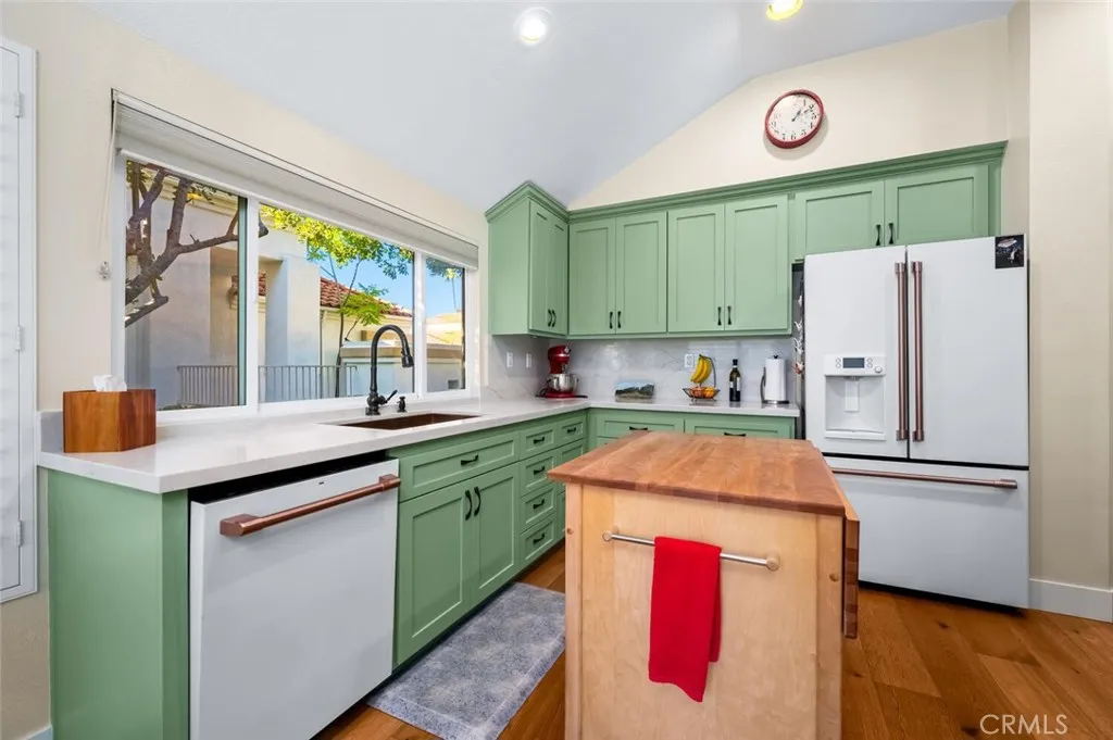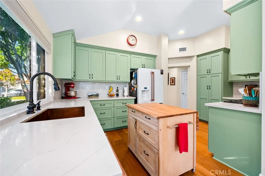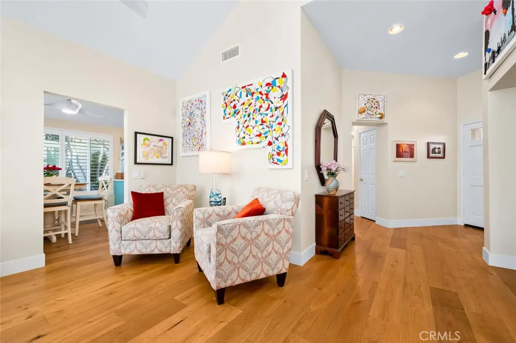 One of our favorites and soon to be yours within the 55+ Palmia community! Single Level, Two Bedroom PLUS Den/Office & Two Full Baths. This one is a Charmer with a Delightful Location and Fabulous Floor Plan. Entry way leads to a Great Room with Vaulted Ceilings and an Updated floor to ceiling Fireplace surround. Office/Den (no closet or door but could be added) is toward front of home with Bedrooms on opposite wings. Home features a FABULOUS REMODELED Kitchen with newer cabinetry, Quartz countertops, and GE appliances with Upgraded copper handles. Kitchen has a charming Nook for dining, Soft close Cabinetry, Light and Bright with several Windows overlooking the Greenbelt. Beautiful French Oak hardwood flooring, Plantation Shutters, and Ceiling Fans adorn the home. Decorator Wall in Secondary Bedroom. Primary Bedroom has Patio Access and also a REMODELED Ensuite bath - Walk in Closet, Dual Vanities and Shower. Both bedrooms have closet organizers to maximize the space. The Yard features areas for planting, dining and enjoying the outdoors. Patio Wall was built higher for added privacy and there is a gate direct for easy access to Greenbelt. The 2-Car Garage has an extended area for Washer/Dryer, Built in Cabinetry and Epoxied garage floor. Additional features include hideaway screen at front door, the home has been re-piped, newer water heater, newer heating/air conditioning units and Air ducts. Residents enjoy the Palmia Amenities including Clubhouse, Fitness Center, 3 Swimming Pools/Jacuzzi's, 18-hole Putting Green, Pickleball and Tennis Courts, Bocce, Shuffleboard +++. M