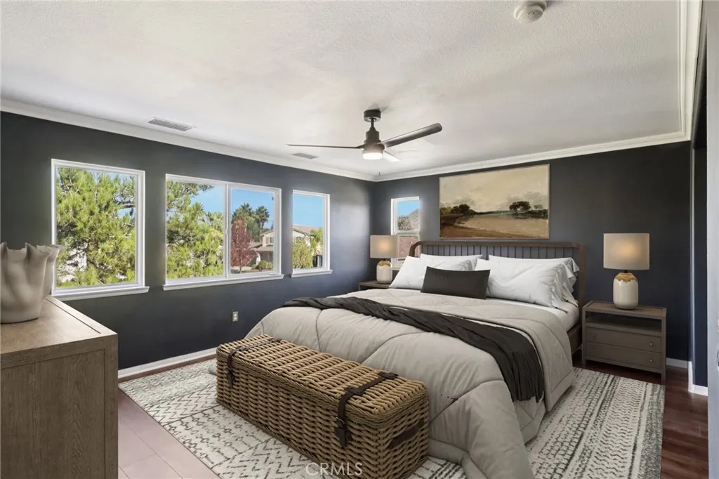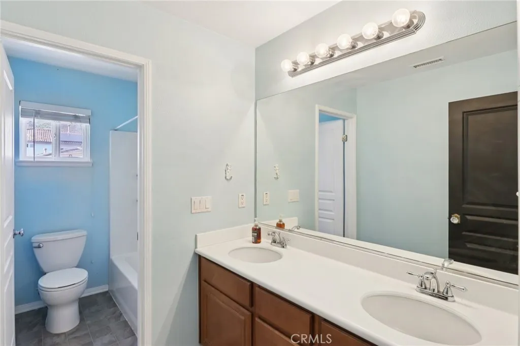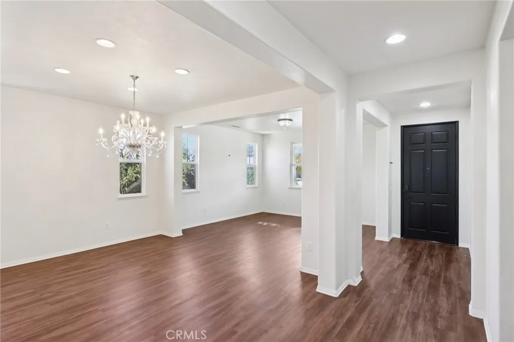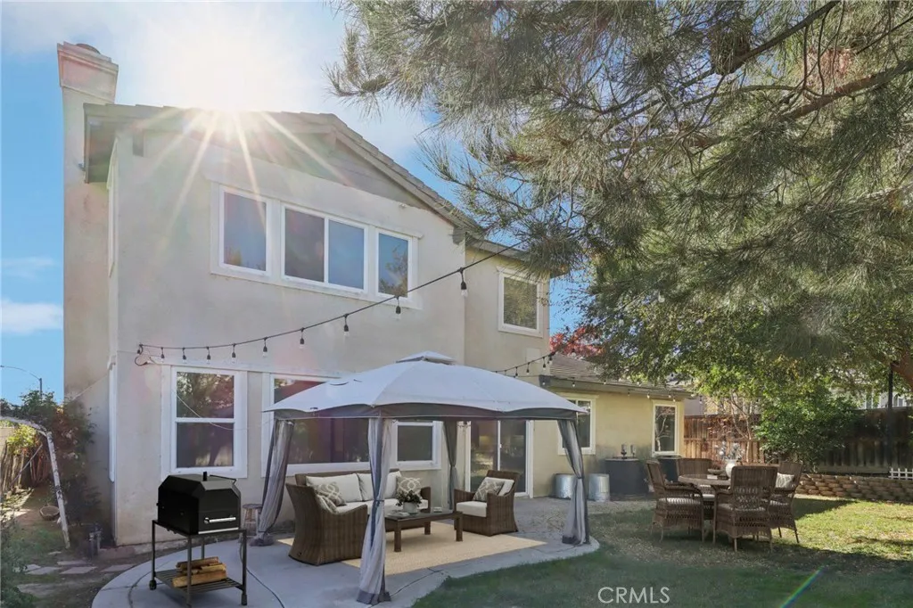 Beautiful curb appeal welcomes you home with manicured landscaping, a lush front lawn, and inviting front-porch entry, perfectly placed on a desirable corner lot. Inside, enjoy brand-new LVP flooring and new appliances enhancing the bright and functional layout. Formal living and dining spaces greet you off the entry, while the main level also offers a convenient bedroom and full bathroom. The spacious family room features a stunning rock-framed fireplace and opens to a breakfast area and large kitchen appointed with stainless steel appliances, double oven, abundant cabinetry, a center island, and a window overlooking the backyard. A sliding door leads to the charming outdoor space with mature trees and a relaxing patioideal for gatherings or quiet afternoons. Additional main-level conveniences include a direct-access 2-car garage with an attached storage room and a generously sized laundry room with built-in cabinetry. Upstairs are three bedrooms and two bathrooms, including an oversized primary suite with richly toned walls, a massive walk-in closet, and a luxurious en suite bathroom offering a jetted tub, separate shower, and dual-sink vanity. Located close to schools, hiking trails, shopping centers, and the 215 freeway, this home also grants access to the sought-after Heritage Lake community. Enjoy low HOA fees and incredible amenities including two pools, a kids splash park, a catch-and-release lake, jogging trails, soccer and football fields, tennis courts, and moreall with unbeatable convenience to everyday essentials.
