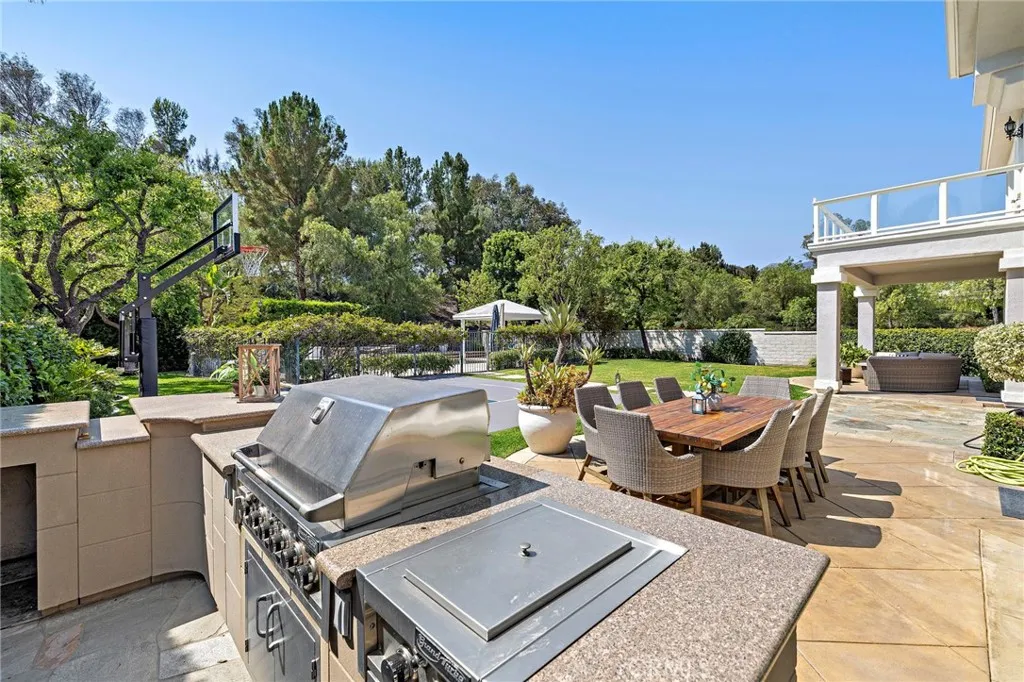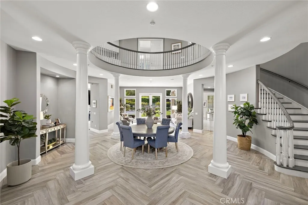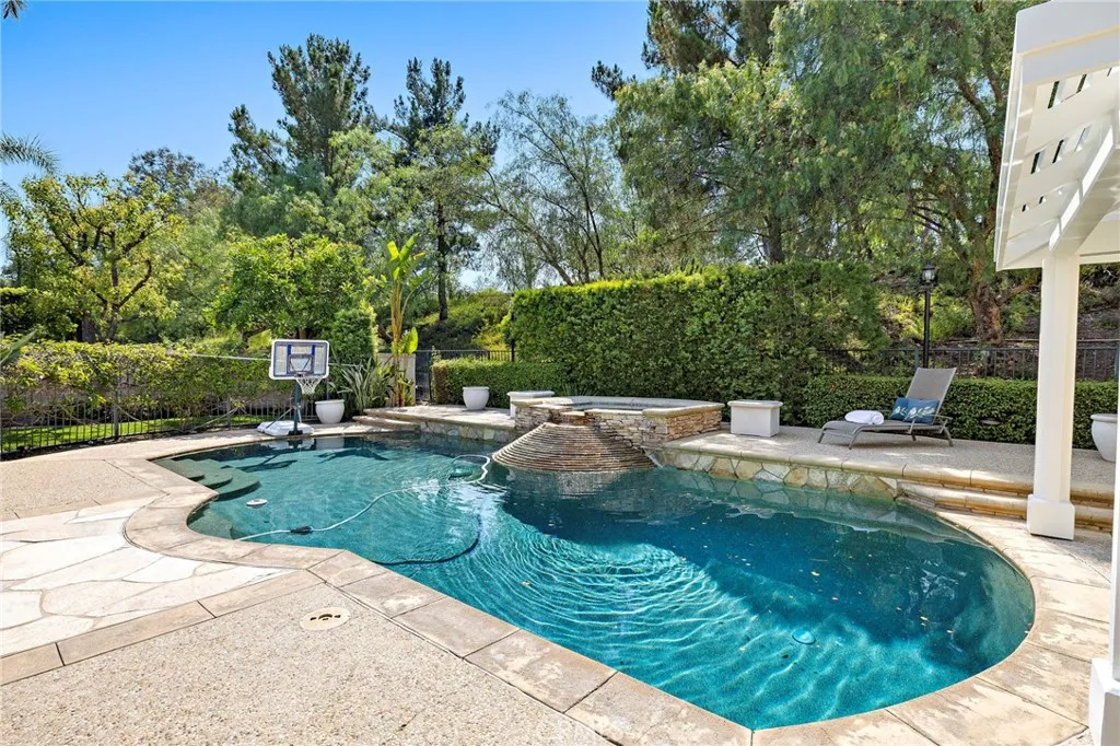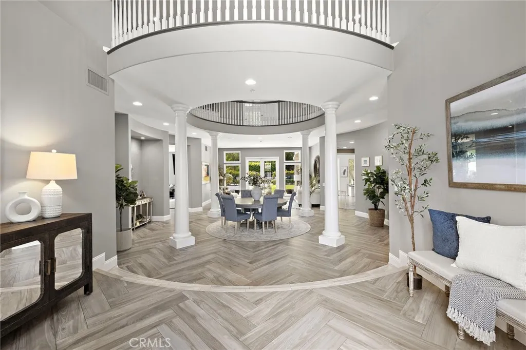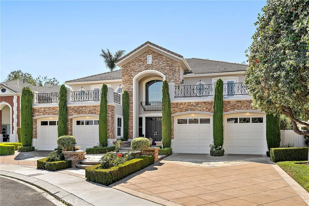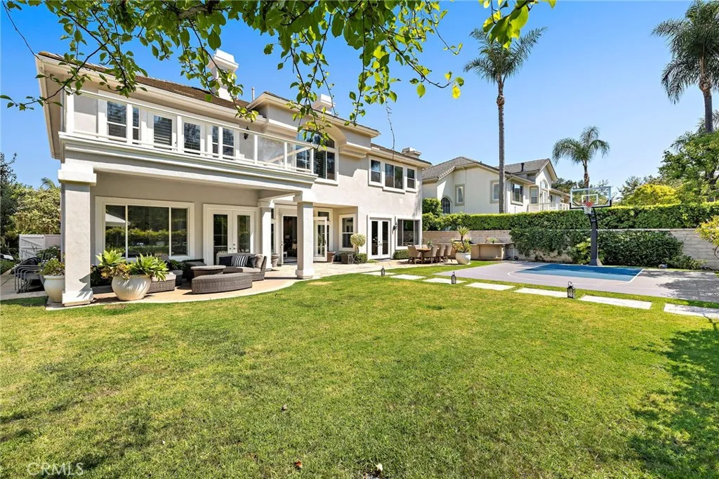 Welcome to Grand Coto Estates. Situated on a Private Cul-De-Sac with Close Proximity to the Gate, enjoy Resort-Style Amenities in this magnificent property. Boasting an expansive 14,000 square feet lot (est.), this home offers unparalleled privacy and space. Step inside through double door entry to a gracious foyer, revealing formal living and dining rooms ideal for sophisticated entertaining. The kitchen, opening to the family room, features a large center island, built-in stainless steel appliances, a spacious walk-in pantry, and a bright breakfast nook. Adjacent, open family room provides a cozy retreat with a fireplace and custom built-ins for your entertainment system. This versatile floor plan includes a convenient main floor bedroom with a private bath and walk-in closet, perfect for guests or multi-generational living. A dedicated den/office with a built-in bookcase and French doors offers a quiet workspace and can be converted into a Sixth bedroom, opening directly to the serene private yard. Upstairs, the luxurious primary suite with a double-door entry, an oversized retreat, and a cozy fireplace. French doors lead to a large private balcony, offering inviting views of the meticulously landscaped backyard. The spa-like primary bath features a separate shower and soaking tub, dual sinks, a vanity, and an oversized walk-in closet with custom organizers. Generously sized secondary bedrooms each include their own private baths, ensuring comfort and privacy for everyone. The resort-style backyard is an entertainer's paradise, showcasing a sprawling grassy area, a gated
