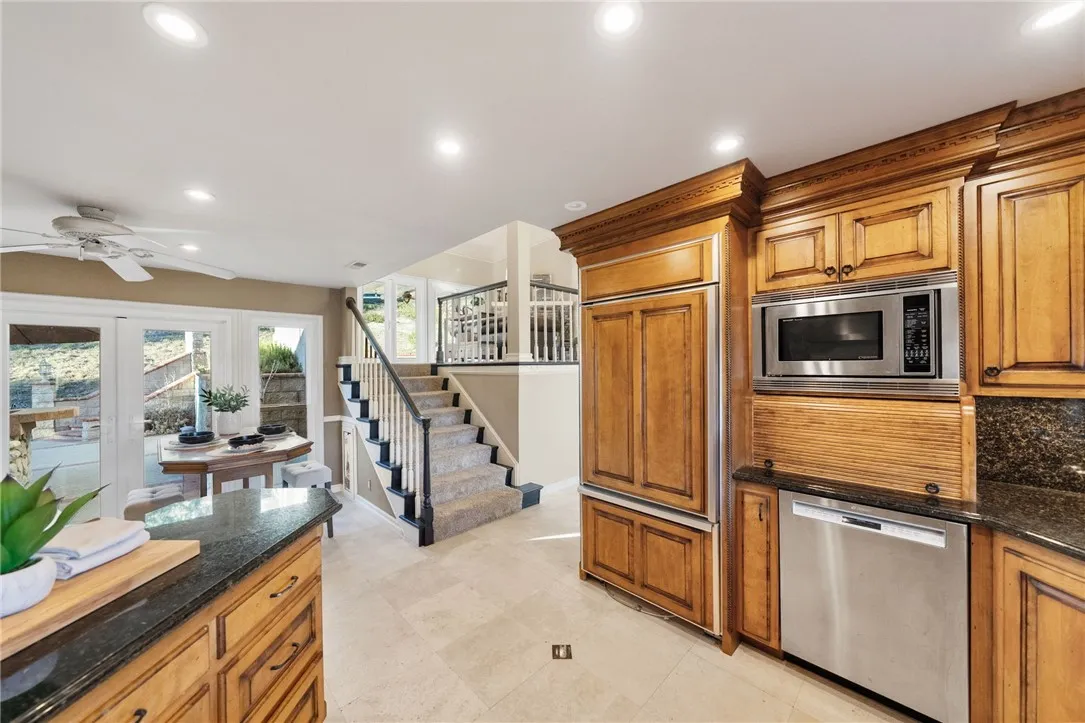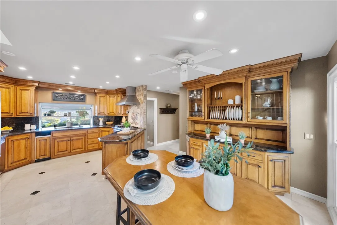 ENJOY SWEEPING TEMECULA MOUNTAIN VIEWS AND BREATHTAKING SUNSETS from this well-appointed Los Ranchitos custom estate! This five-bedroom Cape Codinspired residence offers SOLAR and sits on approximately 2.32 acres overlooking coveted South Temecula. A gated private drive leads to an elegant entry with a leaded-glass door, travertine flooring, soaring ceilings, plantation shutters, and thoughtful designer details throughout. The main-level primary suite enjoys its own private deck, a spacious walk-in closet, a jetted soaking tub, dual sinks with a vanity area, and generous linen storage. Two additional bedrooms offer en-suite bathrooms, while two more share a full bathroom with dual sinks and a walk-in shower. The home features a dedicated downstairs office and an expansive formal living room with a brick-accented fireplace, vaulted ceiling, and inviting window seats perfectly positioned to take in the breathtaking views or an afternoon read. The adjacent formal dining room enjoys spectacular views from oversized windows and is enhanced by a chandelier set within a ceiling medallion and framed by crown molding. The beautifully designed kitchen showcases granite counters, a hooded cooktop with tile backsplash, a pot filler, a trash compactor, stainless steel appliances, a GE Monogram built-in refrigerator, a bay window, a large built-in buffet with storage, and a charming breakfast nook. Overlooking the dining room is the warm and welcoming family room, complete with a second fireplace and two sets of double doors opening to a covered patio with a gas firepit, creating a seaml