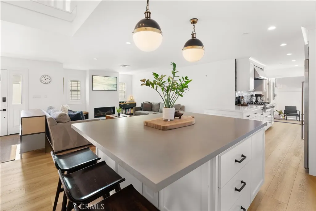 Thoughtfully reimagined with refined coastal living in mind, every inch of this expansive beachside retreat exudes quality, comfort, and sophistication. This stunning four-bedroom, four-bath renovated and expanded residence is located just two blocks from one of Newport Beachs most sought-after stretches of sand, and moments from acclaimed restaurants, boutique shops, and award-winning schools. The main level welcomes you with wide-plank flooring, dramatic soaring ceilings, and an airy open-concept layout. Elevated by high-end hardware and designer finishes throughout, the home reflects a commitment to craftsmanship at every turn. At the heart of the home lies a remarkable chefs kitchen, featuring custom cabinetry, sleek quartz countertops, premium high-end appliances, and professional-grade stainless steel appliancesseamlessly flowing into the generous living and dining areas, complete with built-ins, designer lighting, and a cozy fireplace. Also on the main level is a spacious bedroom with a tastefully remodeled en-suite bath, a versatile bonus room ideal for a home office or gym, a second updated full bath, and abundant storage throughout. Upstairs, the primary suite is a true sanctuary with its own private deck, a spa-inspired en-suite bath with jetted tub and dual vanities, and a large walk-in closet. Step out to the rooftop deck for panoramic coastal views and refreshing ocean breezes. Two additional upstairs bedrooms feature custom closets, vaulted ceilings, and upscale lighting, accompanied by a flexible bonus space perfect for a media room, teen lounge, or secondar