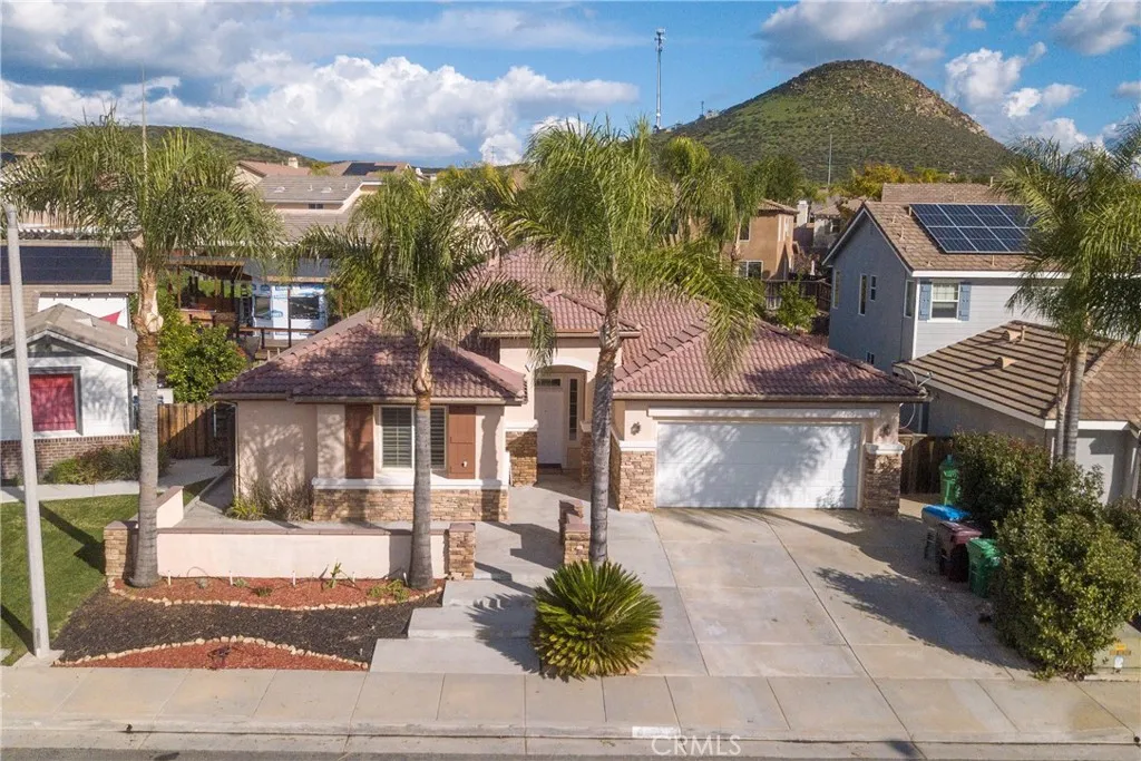 Highly desirable Menifee single-story home with pool, spa, and covered California room, built for easy indoor-outdoor living. There are 4 bedrooms and 3 bathrooms, with no HOA at the top of a cul-de-sac. The great room opens to the backyard entertainment area, and the dining room includes a slider to the pool patio. An additional living room/den adds flexible space for work or relaxation. The kitchen features tons of granite counter space and lots of cabinets as well as a large island. The kitchen opens to the large family room for easy entertainment and everyday living. The layout maximizes privacy with smartly separated bedroom wingsone bedroom and full bath in its own wing, two additional bedrooms in the opposite wing with a Jack-and-Jill bathroom, and the primary suite at the rear of the home overlooking the pool. The spacious primary bedroom features a ceiling fan and patio access. The ensuite bath includes a designer shower, dual sinks, walk-in closet, and modern finishes. Set at the top of a quiet cul-de-sac with no HOA, the low-maintenance backyard offers easy-care landscaping, a large pool and spa, and a shaded California room for comfort year-round. Additional highlights include a 2-car garage and solar panels for energy savings. A rare findsingle story, pool, solar, and no HOA in a prime location.