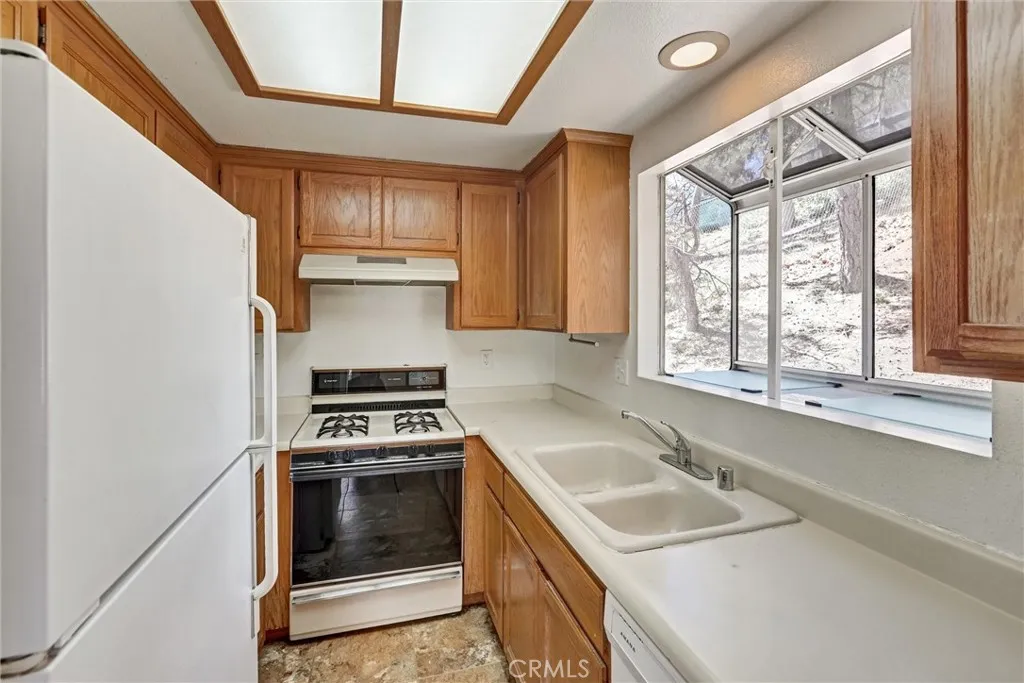 Charming and well-cared-for mountain retreat featuring a roof replaced in 2022 and a warm, inviting layout. Enter on the main level into the comfortable living room highlighted by a brick corner fireplace and an abundance of front windows that fill the space with natural light. The dining area offers built-in cabinetry, a ceiling fan, a storage/pantry closet, and sliding glass doors that lead directly to the deck, perfect for enjoying the peaceful mountain setting. This level also includes a convenient half bathroom combined with the laundry area. The galley-style kitchen is equipped with a double wall oven, a separate range, dishwasher, microwave, and a garden window overlooking the backyard. Upstairs youll find two bedrooms with vaulted ceilings that create an open, airy feel. The larger primary bedroom faces the front of the home and features multiple windows with a beautiful view, a ceiling fan, mirrored closet doors, and a built-in office nook. The second bedroom is situated toward the rear and also includes high ceilings, a ceiling fan, and mirrored closet doors. A full bathroom with tub/shower combo and a linen closet complete the upper level. Outside, a storage shed sits at the end of the deck, ideal for firewood or outdoor gear. The buildup area offers additional storage space, a utility sink, and a whole-house generator with transfer switch for added peace of mind. The property also includes private off-street parking for at least two vehicles. Conveniently located just off Highway 18 (Rim of the World Hwy) and within walking distance to local shops and services.