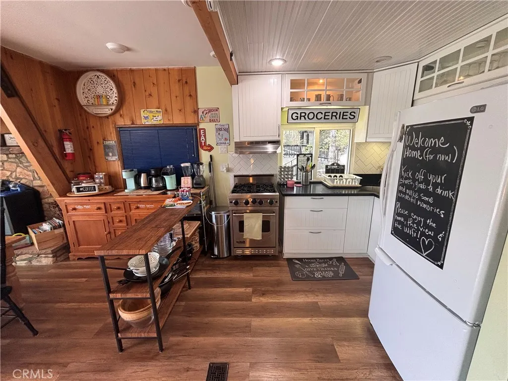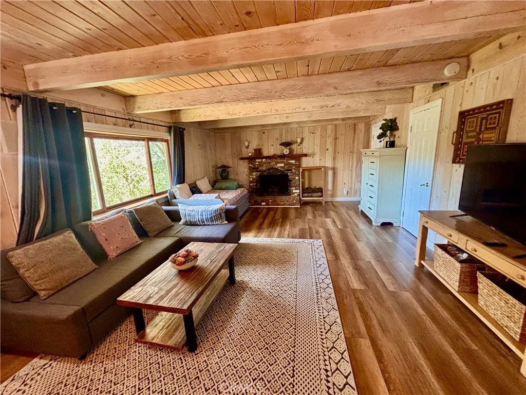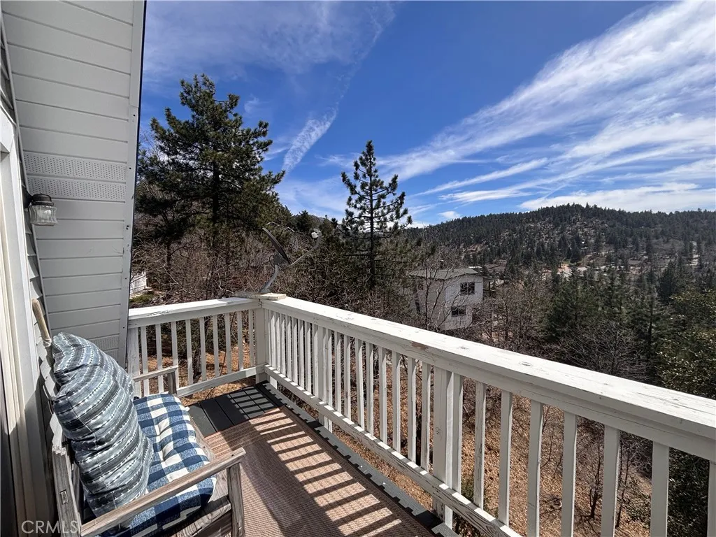 This home offers 3 bedrooms and 2 1/2 bath with an extra large bonus room, which can be used as a 4th bedroom. Experience breathtaking mountain views from the charming deck off the living room, perfect for soaking in the natural beauty. The home offers convenient parking with a gentle slope and just a few steps to the front door. Inside, the updated kitchen shines with its clean and modern aesthetic, seamlessly integrating into the home's inviting floor plan. This Gambrel-style home spans three levels. The uppermost level hosts two cozy bedrooms and a bathroom, providing a private retreat. On the main level, you'll find a well-appointed kitchen, an additional bedroom and bathroom, a dining area, a cozy fireplace, and a spacious living room that opens onto the deck, ideal for enjoying the stunning views. The lower level is a haven of relaxation, featuring a large living area with beautiful, beamed ceilings, a third bathroom, a laundry area, and access to the backyard. A second fireplace adds warmth and charm, making this space perfect for unwinding. Located in one of the nicest areas of Running Springs. 1-Year Lease, furnished and fully equipped.