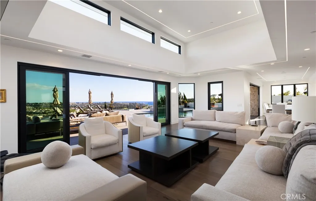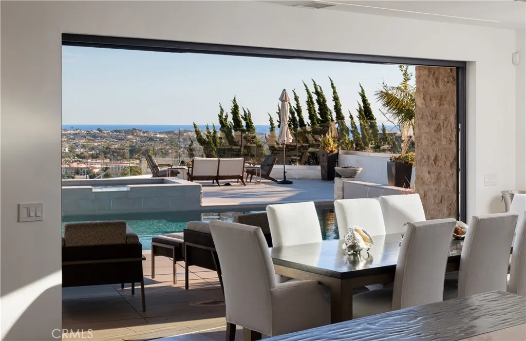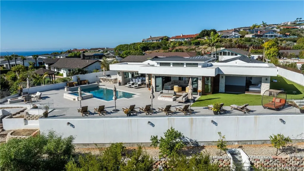 Experience sweeping panoramic ocean and mountain views from this fully remodeled, single-level contemporary home in the coveted Monarch Bay Terrace of Dana Point. Set on an expansive 25,840 sq ft lot, the property captures amazing sweeping coastline views from San Diego to Dana Point, along with dramatic mountain backdrops stretching to Saddleback Mountain. Nearly every major room is oriented to these rare, wide-angle sight lines, creating a coastal living experience that feels open, elevated, and endlessly scenic. Offering approximately 5,000 sq ft of refined living space, the home features four spacious en-suite bedrooms and 5.5 bathrooms. Reclaimed Hickory floors, three fireplaces, and seamless pocketing doors blur the line between indoors and out, welcoming ocean breezes and natural light throughout. The primary suite boasts some of the propertys most impressive vistaswake up to morning ocean views from bed, unwind in the spa-inspired bathroom with steam shower, and enjoy a private outdoor shower and patio overlooking the coastline. Designed for both daily living and effortless entertaining, the chefs kitchen is equipped with Sub-Zero refrigeration, a Miele built-in coffee maker, two dishwashers, a Wolf double oven and 6-burner cooktop, dual islands, and abundant prep and storage space. Additional interior amenities include a temperature-controlled wine cellar, indoor dog wash, full smart-home system, integrated security cameras, and an oversized three-car garage with dual EV chargers. The resort-style grounds maximize the homes extraordinary exposures. A heated pool an
