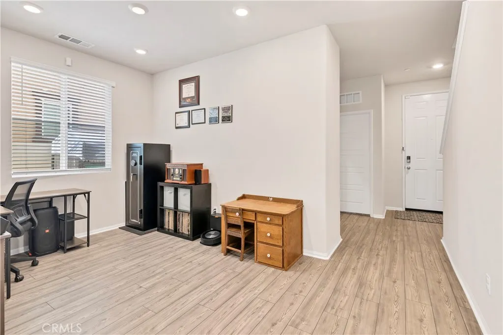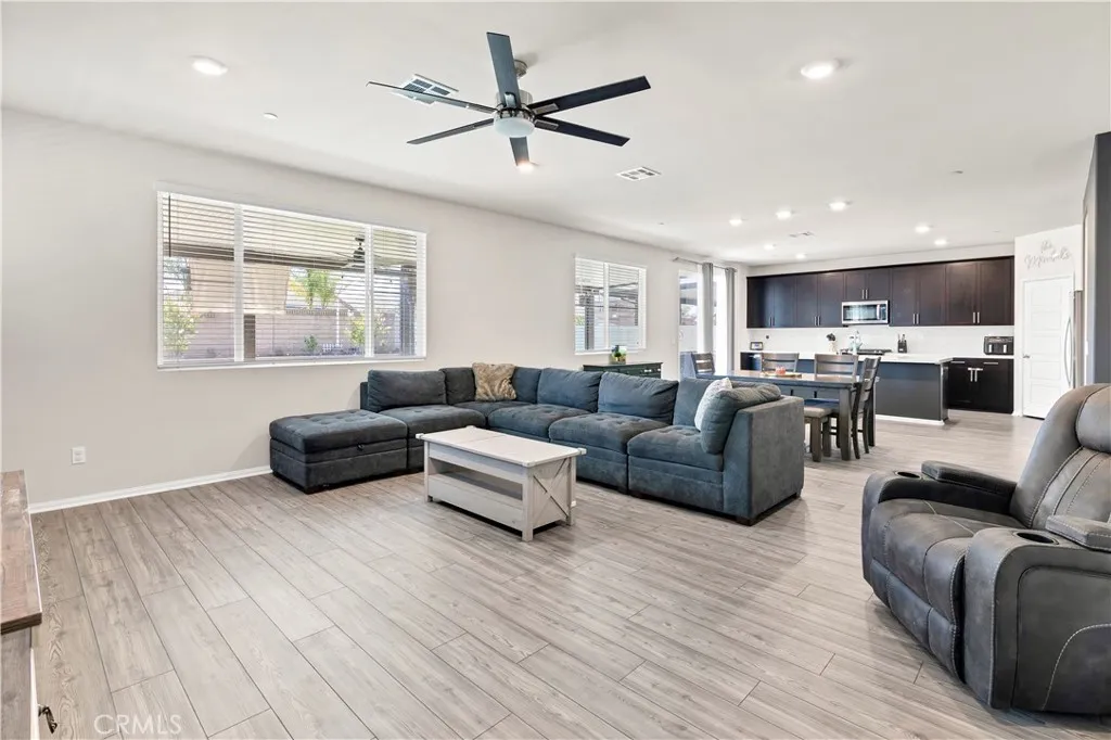 Well-maintained 4-bedroom, 3-bathroom home located in Menifees desirable Sumac Ridge community, offering 2,723 sq. ft. of living space on a 6,382 sq. ft. lot. Conveniently located near the I-215, this home is ideal for commuters while still offering the comfort of a quiet suburban neighborhood. The first floor features a guest bedroom, full bathroom, dedicated office/flex space, and an open-concept great room and family kitchen that work perfectly for everyday living and entertaining. The kitchen includes a large island, pantry, and ample cabinetry. Upstairs offers two additional bedrooms, a full bathroom, a conveniently located laundry room, and a spacious loft ideal as a second living area or flex room. The primary suite provides a private retreat with an oversized walk-in closet and ensuite bathroom. Energy-efficient features include fully paid-off solar panels and a tankless water heater. The backyard has over $50,000 in upgrades and is both family and dog approved, making it ideal for entertaining, play, or relaxing outdoors. Additional highlights include an attached garage with epoxy flooring. Sumac Ridge is a family and pet friendly community with a tot lot and close proximity to parks, schools, and shopping. A great opportunity to enjoy space, comfort, and efficiency in a sought-after neighborhood.