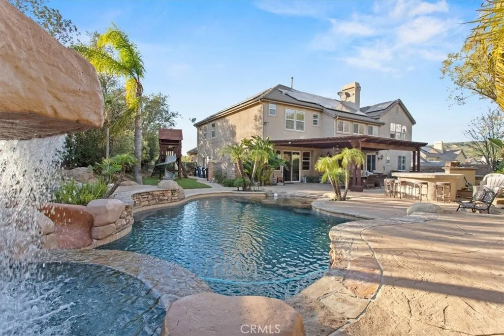 Welcome to Castlewood at Big Sky, one of the areas most coveted communitieswhere wide-open spaces, dramatic mountain scenery, and serene natural beauty create a truly special place to call home. Backed by the stunning presence of Whiteface Mountain, this peaceful enclave offers the perfect blend of privacy, luxury, and Southern California indoor-outdoor living. Tucked away at the end of a quiet cul-de-sac and up a long private driveway, located next to open space, this exceptional property showcases breathtaking mountain and valley views, 5 spacious bedrooms, 4.5 baths, and an entertainers backyard that rivals a private resort. From the moment you arrive through the gated courtyard entry, youll appreciate the thoughtful layoutInside, an expansive and light-filled floor plan unfolds. The formal living room, anchored by a cozy fireplace, opens to a charming courtyard with a tranquil fountainsetting the tone for relaxed elegance. A warm and inviting family room features its own fireplace, built-in entertainment center, and views of the sparkling pool beyond. Perfect for hosting, the elegant formal dining room flows seamlessly into the sun-drenched gourmet kitchen, complete with granite countertops, abundant cabinetry, a center island with sink, walk-in pantry, and a full suite of stainless steel appliancestruly a chefs dream. The main level also includes a bedroom with a private bath, a laundry room, and a convenient powder room for guests. Up the grand staircase, the luxurious primary suite awaitsyour personal retreat. This expansive haven includes a fireplace, sitting area,