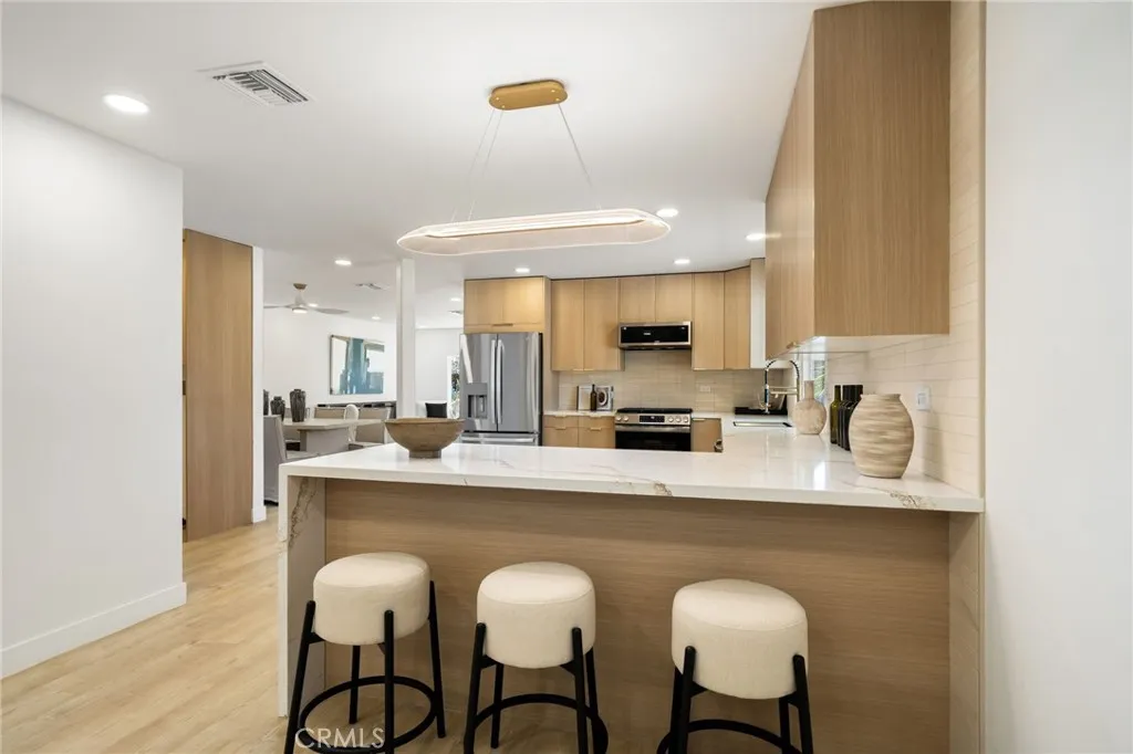 PRICED TO SELL! Welcome to the nicest home in Tri Palm Estates & Country Club! From the level-5 smooth finish drywall to the designer tile and quartz waterfall countertops - no detail was overlooked, and no expense was spared. Fully renovated with new systems and the highest quality designer finishes. Gorgeous kitchen with new white-oak cabinets with a soft close, quartz countertops with a waterfall edge, oversized peninsula with bar seating for three, stylish limestone backsplash, and brand-new stainless-steel appliances including a 36' French door fridge and workstation sink. The designer went the extra mile with a luxurious 80'' high efficiency electric fireplace, one-of-a-kind brass fixtures, elevated aluminum and glass closet doors, and solid core steel exterior doors. Primary bedroom has a resort style feel with a large seating area and bathroom with an oversized freestanding soaking tub, walk-in shower with LED-lit niches, and a custom dual sink vanity. Fresh-modern style with recessed LED lighting and timeless white-oak LVP flooring. Brand-new central HVAC heat pump system with a 10-year warranty. Oversized carport, enclosed storage area, and a large side lot. Oversized interior corner lot. Fee land with low HOA (55+). 433a enables VA, FHA, conventional loans, and reverse mortgages for ease of financing. Ground level, no interior or exterior steps, and curb-less walk-in primary shower. Enjoy two 18-hole golf courses, multiple swimming pools, hot tubs, tennis courts, shuffleboard, pickle ball, putting green, billiard room, clubhouse and a bar/restaurant. Major stores