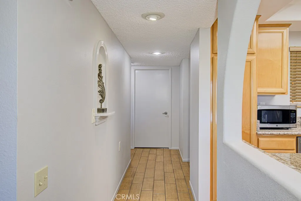 An elevator takes you practically to the front door of this beautifully upgraded, top floor VILLA NUEVA model, and OH, WHAT A VIEW! Property is UNFURNISHED. All appliances in photos are included. This home is perched atop a hill, surrounded by trees and greenery. Enjoy vistas of the neighborhood, valley lights and Saddleback Mountain, and nearby access to the 73 Toll Road. The heart of the home an extraordinary, transformed kitchen features custom cabinetry topped with luxurious slab granite and high-quality LG appliances. A rare kitchen skylight fills the space with natural light. Elegant ceramic tile floors mimic wood while offering water resistance. An ingenious bar under the arched opening connects the kitchen to the living room perfect for a casual bite or storing large serving pieces. The kitchen opens to the dining area and living room, making entertaining easy. The dining rooms mirrored wall reflects the sweeping view through large glass doors, drawing your eye outdoors to the serene neighborhood and trees below. The generous living room features lush slate-gray carpet with extra-thick padding and a large dual-paned window that frames the view and welcomes coastal breezes. A central hallway leads from the front door through the main living areas, and in the opposite direction to bedrooms and bathrooms. The guest bedroom offers a peaceful view of the trees through dual-pane windows with plantation shutters, plush carpet, a large closet, and space for a queen-sized bed. The adjacent guest bathroom features a vanity, tub with newer shower door and fixtures. Welcome