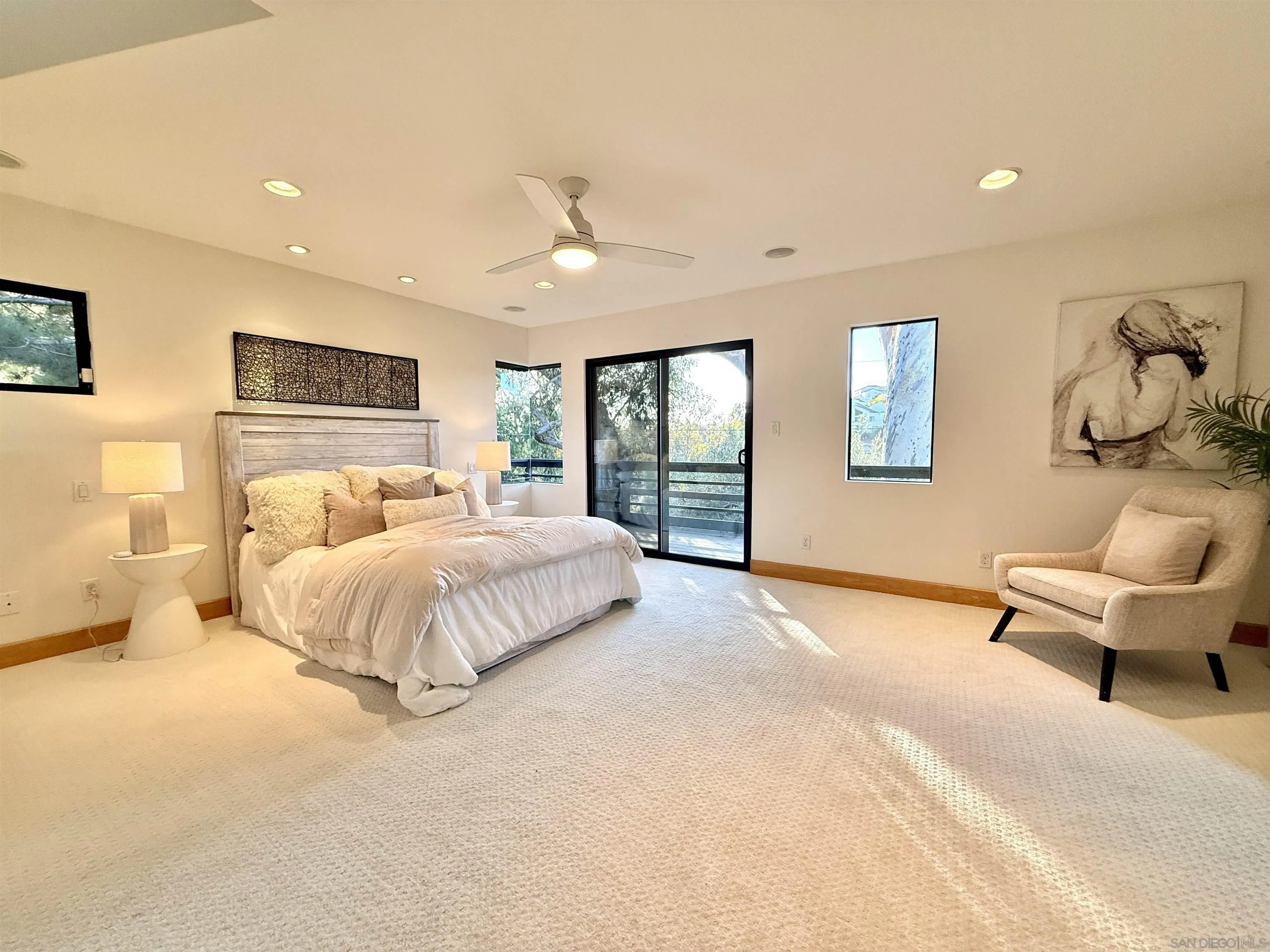 Discover a truly rare Hillcrest retreat—a custom architectural masterpiece designed by award-winning architect Derek Heeb and tucked along a quiet private street with no through traffic. This beautifully updated 2,806 sq. ft. home features 2 En-suite bedrooms plus two versatile loft spaces ideal for a 3rd bedroom, office, or studio, along with 3.5 baths. Flooded with natural light from 56 windows, skylights, and a stunning two-story atrium, the home offers freshly painted interiors and exterior, refinished wood floors, newer carpet, and fully owned solar with a Tesla battery. The spacious living room with fireplace opens to peaceful canyon breezes, while the kitchen boasts abundant cabinetry, pantry, and striking “Blue Eyes” granite. Artistic touches shine throughout, including custom stained-glass doors, hand-made tiles and brass sinks, artisan light sconces, and a remarkable 400,000-year-old fossil slab in the primary shower. Both bedrooms and loft open to outdoor spaces surrounded by mature foliage, soothing water features, and total serenity. Additional highlights include a 2-car garage with extensive cabinetry and workspace, ample guest parking, surround sound, and no HOA or Mello-Roos. Moments to Balboa Park, shops, eateries, downtown, and the airport—this one-of-a-kind home is truly unforgettable.