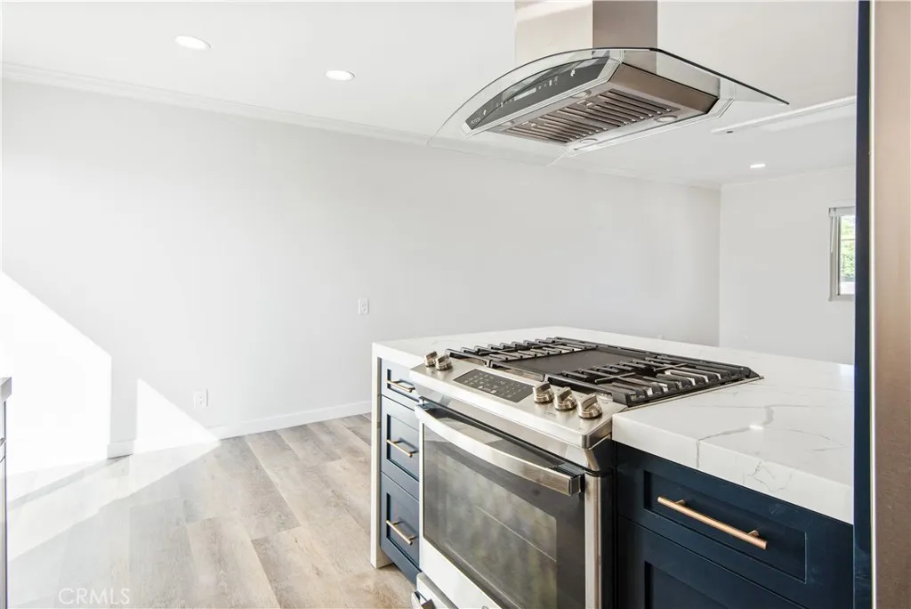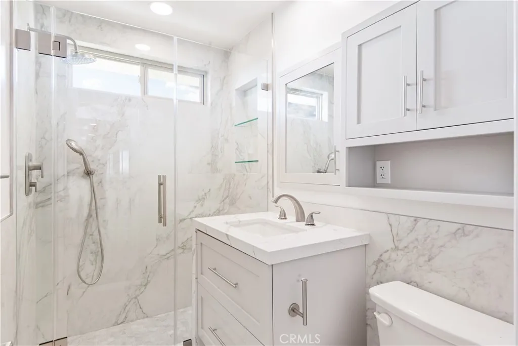 **Little Jewel **2bedroom 1Bathroom completely remodeled 2nd floor unit. Custom Quartz countertop Kitchen comes with all built-in appliances and self-closing cabinets. Private Ample size balcony with a Catalina Island view! Custom built bathroom cabinets and bathroom vanity with top of the line fixtures and state of the art shower stall with bench. The photos will say everything about this rare unit filled with amenities and new waterproof floors, baseboards and ceiling crown Moulding. Brand new multi split air & heat unit in each living area and each bedroom for efficient use and saving in utilities. Quality brand new refrigerator and gas stove with high end vent system. All bedrooms come with custom closet with built in shelves in each closet.Private 1 car garage included with this unit.