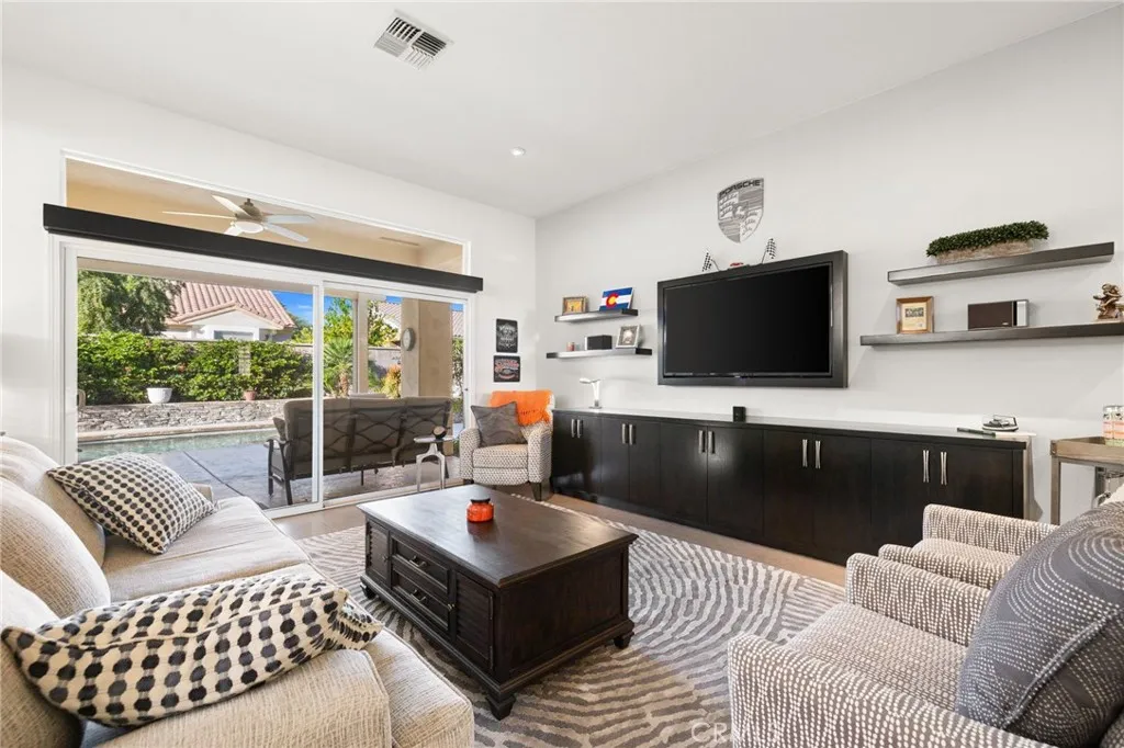 This home is a short term rental already booked for Jan-April the rental fee starting October thru December is $4,995 I am pleased to present this beautifully updated vacation rental property, extended Tangier model home located in Sun City Palm Desert. This property offers a resort-style living experience, featuring a private saltwater pool, spa, and cascading waterfall set within professional desert landscaping. The interior has been thoughtfully remodeled to include a kitchen with quartz countertops and custom cabinetry. The home is characterized by plantation shutters and upgraded LED lighting throughout. The layout features a spacious primary suite with a custom walk-in closet, a guest bedroom with built-in cabinetry, and a versatile separate den. Additional highlights include a laundry room with ample storage and an extended garage equipped with epoxy flooring, built-in cabinets, and a dedicated mini-split AC system to ensure the home is in excellent functional condition. This stunning single-story home delivers elegance, comfort, and timeless style in one of the area's most desirable neighborhoods. Fully prepared and ready for your next vacation, this is an opportunity you don't want to miss! Please be advised that the rental price during the Prime Season, which runs from October through April, is $6,000.00 The property has been rented for the period effective January 1, 2027, through April 30, 2027.