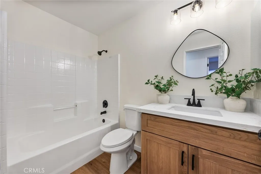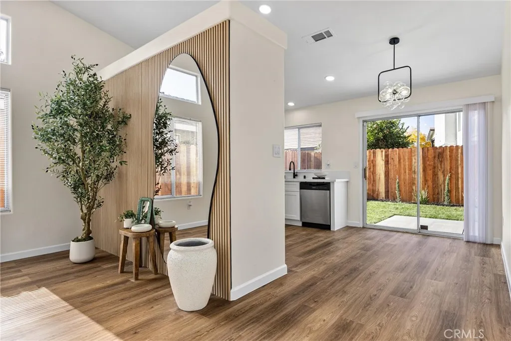 This Southwest Bakersfield home, nestled in the desirable Oaks, is a true gem. It offers 3 bedrooms and 2 bathrooms and has been thoughtfully updated with fresh interior and exterior paint, new wood-like flooring, and quartz countertops throughout. The kitchen features new cabinetry, stainless steel appliances, and refined black hardware. The open-concept living and dining area is anchored by an accented fireplace and a stunning wood slat feature wall with a built-in mirror. Both bathrooms include chic new vanities and mirrors, and the freshly reglazed showers create a clean and modern finish. An interior laundry room with new cabinets adds ample storage and convenience. The exterior showcases new sod in the back yard, complemented by refreshed landscaping and new wood fencing, for an inviting outdoor setting. With a tile roof, stone accents at the exterior, a new garage door and classic curb appeal, this home is move-in ready. Make this Oaks treasure yours today!