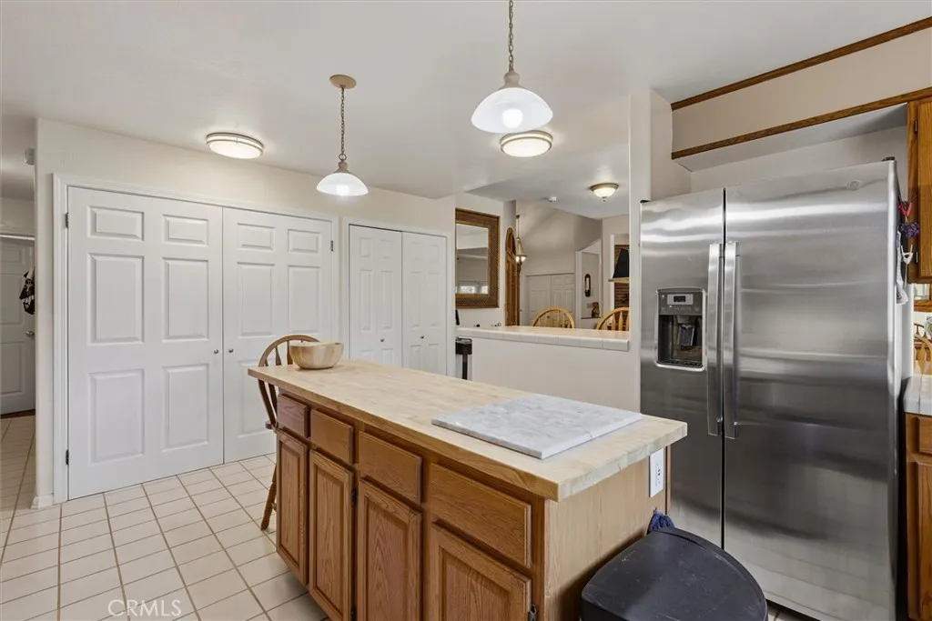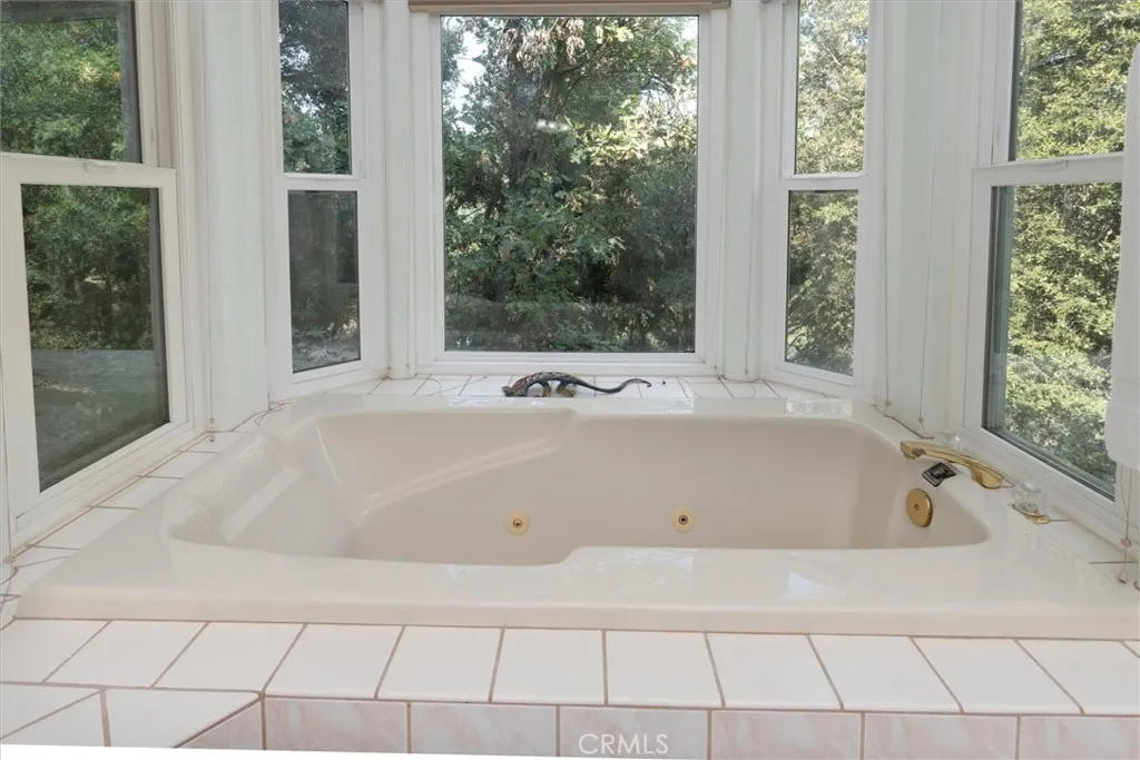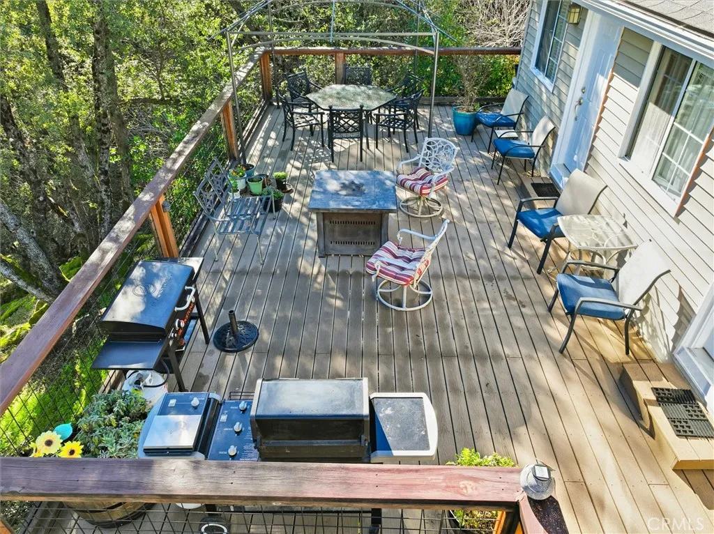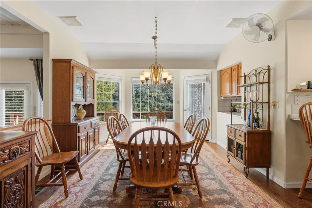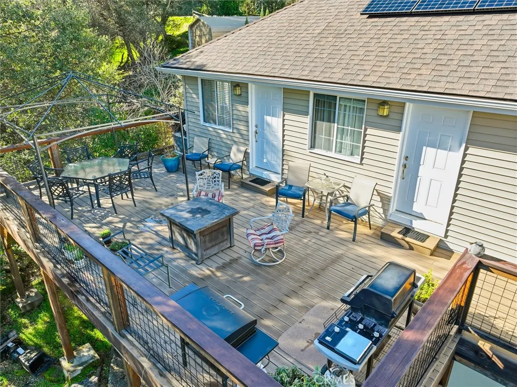 Nestled in a quiet and private neighborhood conveniently located near the towns of Oakhurst and Bass Lake, and only 30 minutes from Yosemite National Park, this turnkey home offers the perfect blend of comfort, efficiency, and natural beauty. Enjoy amazing views from the newly built, expansive back deckperfect for relaxing or entertaining in a peaceful mountain setting. The kitchen is well-appointed with an abundance of cabinetry, a large butcher block island with pendant lighting, double ovens, and generous pantry storageideal for both everyday living and entertaining. The home is energy efficient, featuring leased solar and dual-pane windows. Vinyl siding, a defined entry, and maintained foliage clearance contribute to reduced fire risk and low-maintenance living. This home offers four bedrooms and two bathrooms, with one bedroom thoughtfully converted into a media room featuring beautiful interior French doors. Guest bedrooms include tasteful crown molding, and the remodeled guest bathroom is bright and inviting with a walk-in tiled shower and pedestal sink. The washer and dryer are conveniently located inside a utility room with an additional sink. The oversized primary suite is privately situated apart from the other bedrooms and filled with natural light from multiple windows, including a bay window in both the bedroom and bathroom. The spa-like primary bathroom features double sinks with separate vanity areas, a private toilet room, and a jetted tub perfectly positioned to take in panoramic outdoor views through the bay window. Architectural highlights include high b