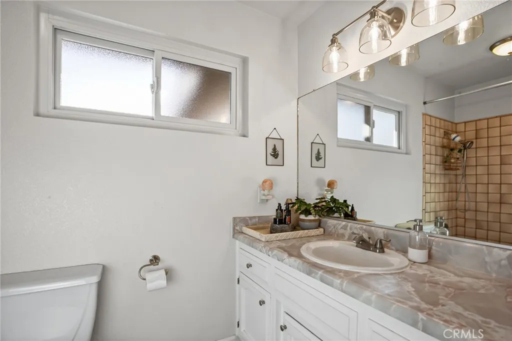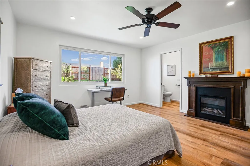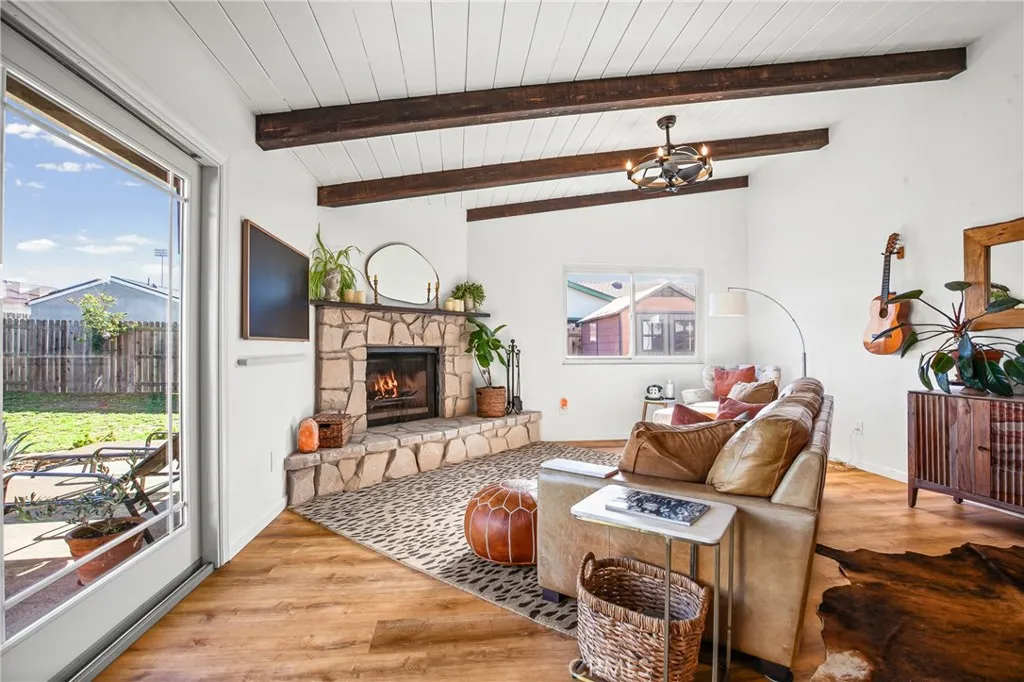 Lots of bright + quality upgrades! Esconced in an established neighborhood, this move-in ready, 2-bedroom/2bathroom home charms from the sidewalk! The moment you walk in youll be delighted with its modern/retro vibe. Every room reflects meticulous care and maintenance. The remodeled kitchen features a 2-year-old stainless steel refrigerator (which stays with the house), stainless steel dishwasher, 5-burner gas stove, brand-new Moen sink faucet, tile countertops with linear mosaic backsplash, a drawered pantry, and solid-wood cabinets. The primary bedroom has a walk-in closet, private bathroom, attic access and a door that opens onto the backyard. The newly plastered walls and vinyl plank flooring throughout imbue the home with a sense of quiet luxury. The refurbished ceiling beams and renewed woodburning stone fireplace lend inviting ambiance to the spacious living room. Youll notice the real-wood interior doors and newer dual-pane windows throughout. The list of quality features and upgrades goes on: an upgraded 200-amp electrical panel, newer light fixtures, and new receptacles, switches and dimmers throughout...in the garage theres extra recessed lighting, attic access, a new, fold-down aluminum ladder to reach the upper storage area, gas and electric washer/dryer hookups (the washer and dryer also stay with the house), a 2007 furnace...extra-spacious RV parking with Ford EV vehicle charger...a new custom-built mailbox at the curb... 5 exit doors which make it easy to get around the house and yards...a large, private backyard with 2 sheds, a fire pit and adorned with a s
