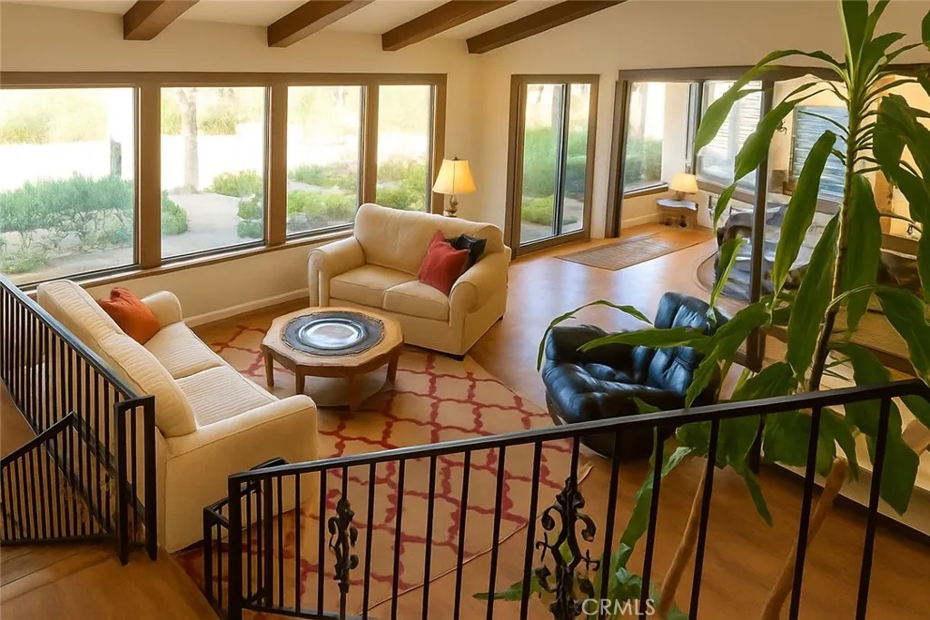 Escape to serenity in this distinctive tri-level retreat, perfectly situated within the gated community of Lake Riverside Estates. Set on 2.69 acres of scenic landscape, this 2,420 sq. ft. home blends architectural warmth, artful details, and the peaceful rhythm of country living just minutes from Temecula Wine Country. Step inside to discover vaulted ceilings with exposed beams, a welcoming Fisher wood-burning stove set in a brick hearth, and open living and dining areas framed by large windows that capture breathtaking mountain and sunset views. The upper level offers a private primary suite with a dual-sink bath and a secondary bedroom. The lower level features a secondary suite with its own bath and a bright, spacious laundry room with cabinetry and utility sinkideal for guests, family, or multi-generational living. A detached library connected to a glass-lined solarium extends the homes living spaceperfect as an art studio, office, or reading retreatwith direct deck access to enjoy peaceful views. Outdoors, enjoy the courtyard with pergola, solar panels, mature landscaping, beautiful olive trees, and a charming ornamental Manzanito treeknown in Peruvian culture for its smooth bark and sculptural form. The property also features a private gated entrance, storage shed, RV access, and ample room to expandwhether for a workshop, guest unit, or additional garage. Among the homes many special touches is a custom bench originally designed by the Disneyland design team, blending artistry and history with the homes inviting character. Residents of Lake Riverside Estates enjoy a