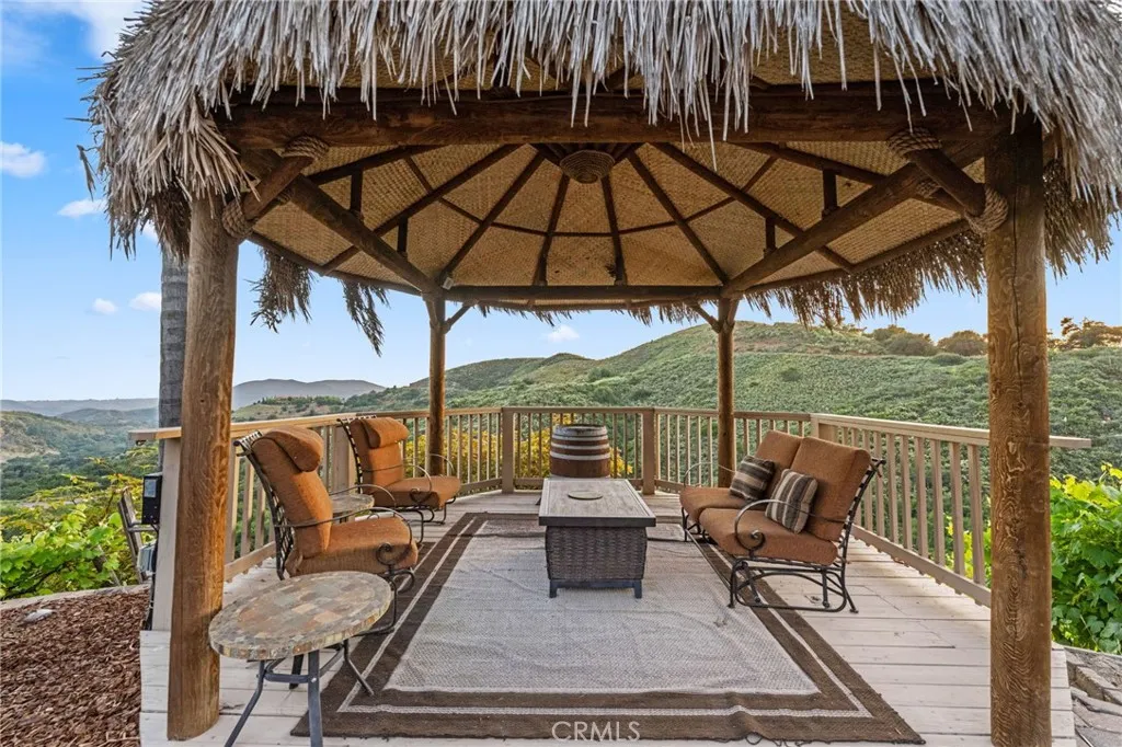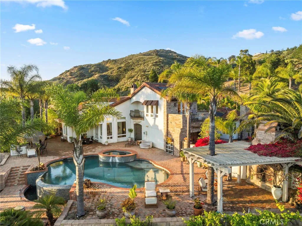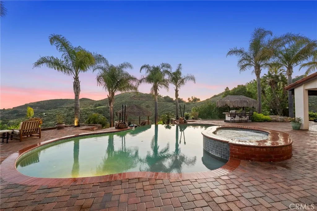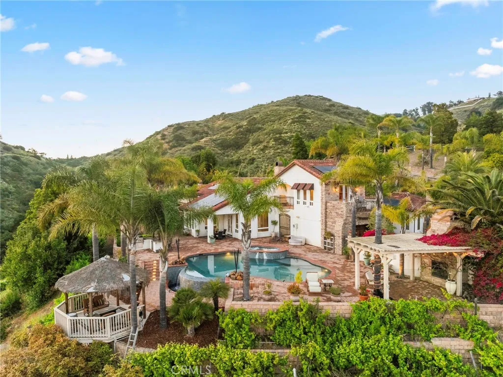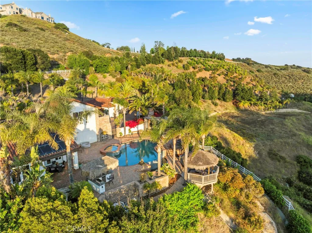 Welcome to 44915 Palladian in the beautiful De Luz community in the hills above Old Town Temecula, tucked away in one of the most premiere privately gated communities in the Temecula Valley, Renaissance Estates. This luxury estate property on almost five acres is thoughtfully laid out with over 4400 square feet of living space, arriving through your very own private electric gate entrance. Beautiful gourmet kitchen with an abundance of wood cabinets and a six-burner Viking stove, Sub Zero refrigerator, and a large walk-in pantry. The main house features a huge master suite with a spacious master bath, including your own two-person jetted tub and a two-sided fireplace. The main house guest bedroom has a walk-in closet, private bath, and its own private patio. The separate casita tucked away close by is perfect for guests, visiting grown children or family, or teenagers wanting their own space. It has its own private living area with fireplace and private bath. There is a second separate guest quarters outside the main house with two balconies and a private bath, the only part of the estate on the second level with views abound. The backyard has a private infinity edge pool, raised spa, forever views all the way to the ocean, outdoor fireplace, palapa BBQ island, and lots of sitting areas. Tropical landscaping all around with many fruit trees. Beautifully finished four-car garage. There is a one-car separate garage attached to the main house that could easily be transformed into additional living space. PAID FOR SOLAR too! You just have to see this one to really feel how trul