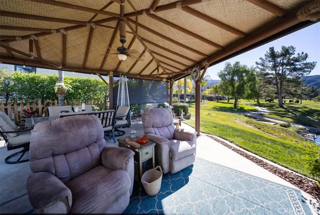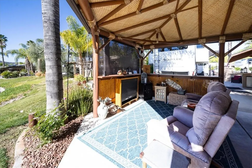 Serenity Now!!! One of the Best Views in the Park with a Waterfront Waterfall View and the 10th Green with Mountains in the Backdrop. This is what you Need to Really Relax and Decompress for the Weekends. You get three Areas of Enjoyment on this Lot. Enjoy the Fire Place - Living Area with lots of Counter space andStorage for Entertaining. The Kitchen Area with Built-In BBQ, Top Burners, Refrigerator, Freezer, Sink and Convection Oven with so much Counter Space. Then there is the Huge Family Room to Soak up the Water Views and Watching the Golfers on the 10th Hole Green. Washer & Dryer Hookups behind the RV. Included in Rancho California RV Resort is a 14 hole Executive Golf Course free for owners, 5 Pools and Jacuzzi areas, Tennis Courts, 14 Pickle Ball Courts, Laundry Rooms, Dog Park, Horse Shoe Lawn, Club House, Hiking Trails, and Restaurant, and convenience store all inside Gated Community that is Guarded 24/7. You can live here or rent your space. Peace and quiet serenity all just 25 minutes from Temecula Wine Country. No age restrictions. Come on over and check this hidden gem of a place out. Fifth Wheel 2024 Solitude 376RD and Golf Cart available as a package deal!