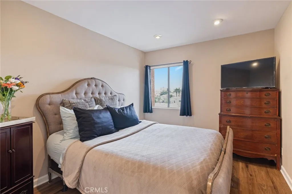 Fantastic views in this private, top floor Condo. Incredible, unobstructed views overlooking Downtown Long Beach from your private balcony & bedroom window, from your kitchen window, view the Gerald Desmond Bridge & the park. Take a walk across the street to Cesar Chavez park and enjoy a nice picnic under one of the many trees. This remodeled, one bedroom, one bath has everything you're looking for in downtown Long Beach. Are you looking for a unit that has a lot of natural light? Watch the sun rise from your living room and balcony, watch the sunset from your kitchen window. This unit has a lot of natural light perfect for plants while you soak in all that good morning sunlight for your dose of vitamin D. The entry features a hallway to the living room with recessed lights & updated flooring throughout. Cool off on those summer days with a mini split air conditioner. The remodeled kitchen includes stylish butcher block counter tops, lower white shaker cabinets with soft-closing drawers with new kitchen cabinet handles, new kitchen blinds, freshly painted kitchen walls to complement the view of the park's green grass & trees from the kitchen window, all Frigidaire appliances are included. The bedroom can accommodate all your bedroom furnishings as well as a desk for those who work from home. The bedroom also has an ensuite walk-in closet that can hold an ample amount of storage. The updated bathroom includes new paint to complement the modern Evoque Arte Porcelain Patterned Floor tile, new vanity, Moen Genta double handle bathroom faucet, light fixture, and new tub and show