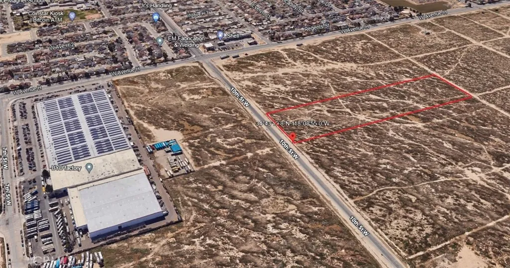 The address is approximately 46135 10th St W, Lancaster, CA 93534 For sale or lease is a 9.85+- acres of light industrial property with 320+- feet of paved road frontage on 10th St W. Electricity, water, and sewer is on front of the property on 10th St W. The potential of this property is astronomical. Some of the commercial uses in the industrial zone areas are but not limited to: Aircraft-Related Uses, Automobile boat, vehicle, tractor dealerships, body repair, building trades, communication facilities, food manufacturing and storage facilities, general manufacturing, high technology research and development, warehousing and storage, emergency shelters etc. Please see the zoning document or the broker can send you a copy of the allowed uses in the light industrial area. This is also near major employers in the Antelope Valley such as NASA, Boeing McDonnell Douglas, Virgin Galactic, Mojave Air and Space Port, Lockheed Martin, Northrop Grumman, BAE Systems, EM Aero Space, Palmdale Regional, BYD Electric Bus Terminal, AV Fair Event Center, the Antelope Valley College, West Wind Computer Science Magnet School, etc. The GPS coordinates are (please enter these in the address section of maps in your smart phone and it will take you to the locations): NW front: 34.722129, -118.148645 SW front: 34.721248, -118.148635 NW rear: 34.722271, -118.152819 SW rear: 34.721345, -118.152819