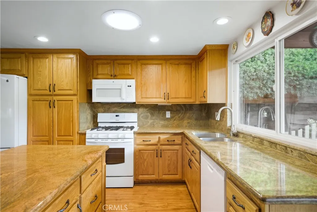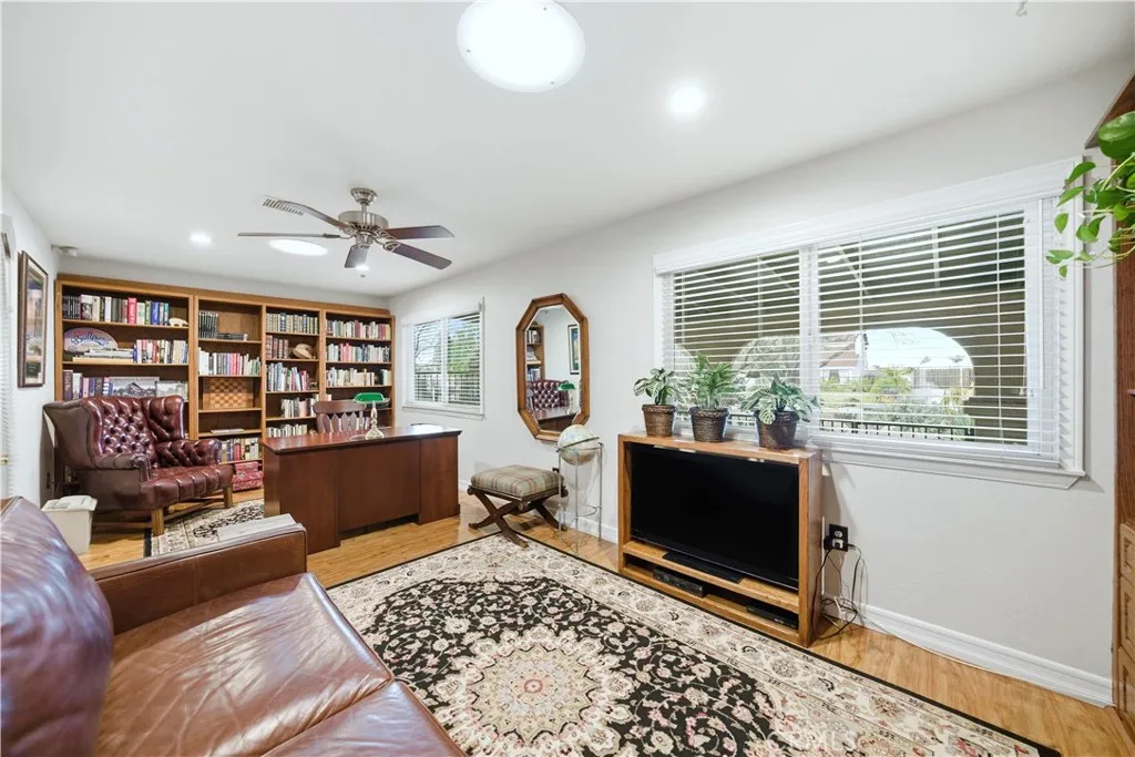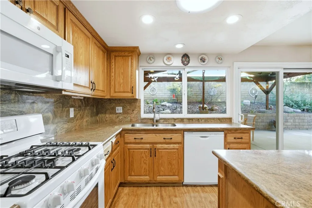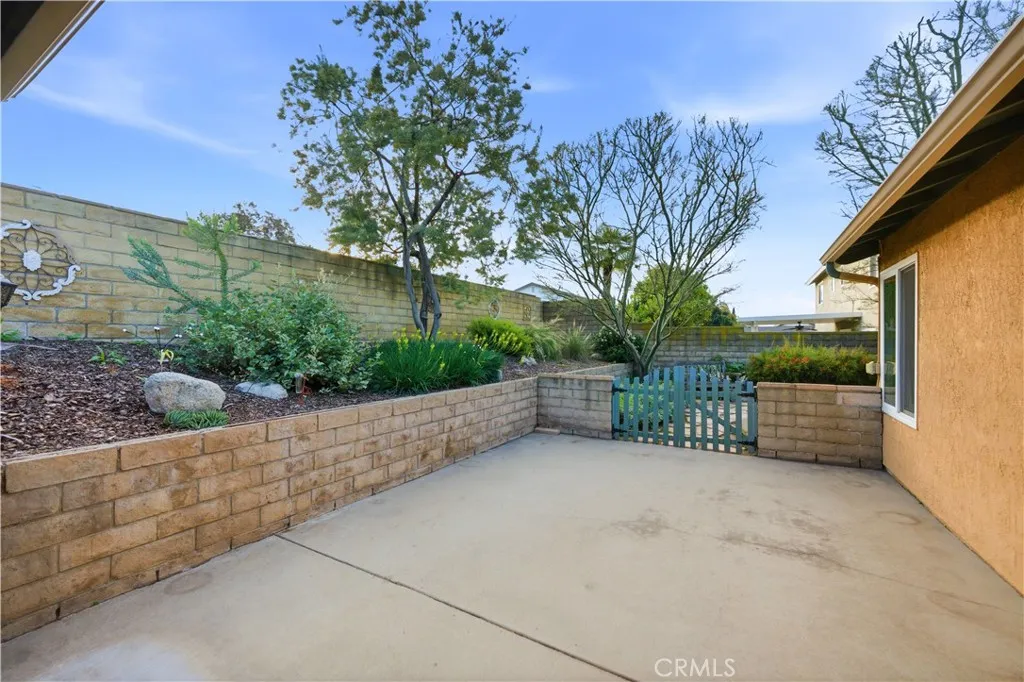 This single-story residence offers approximately 1,340 sq ft of living space on a 7,651 sq ft lot with an open floor plan and defined indooroutdoor flow. The living room features a fireplace, vaulted ceiling, recessed lighting, opening directly to the kitchen and dining area. The kitchen includes a center island, stone countertops, full-height cabinetry, gas range, dishwasher, and a sliding glass door leading to the backyard. The primary bedroom includes double-door entry, mirrored closet doors, ceiling fan, and a private three-quarter bathroom with walk-in shower. A second bedroom with French doors offers flexible use as a bedroom, office, or den or can be converted to create a 3rd bedroom. A full hall bathroom features a tub/shower combination, stone vanity, and updated fixtures. An individual interior laundry room provides cabinetry, shelving, side-by-side washer and dryer space, and natural light. Additional features include central air conditioning, dual-pane windows, skylights, wood-style flooring, and neutral interior finishes. Outdoor amenities include a large covered patio with wood-beam construction, ceiling fans, and a concrete slab suitable for dining and seating. The backyard is enclosed by block wall fencing and features raised planters, stone retaining walls, garden pathways, and drought-friendly landscaping. Side yard access includes a gated area suitable for additional vehicle, boat, or recreational parking. The property includes a two-car attached garage with direct access and a full driveway. Conveniently located near parks, shopping, dining, and major tr