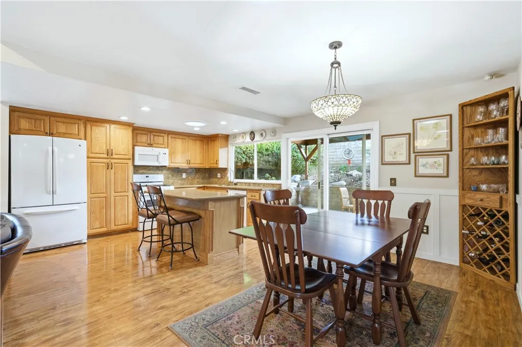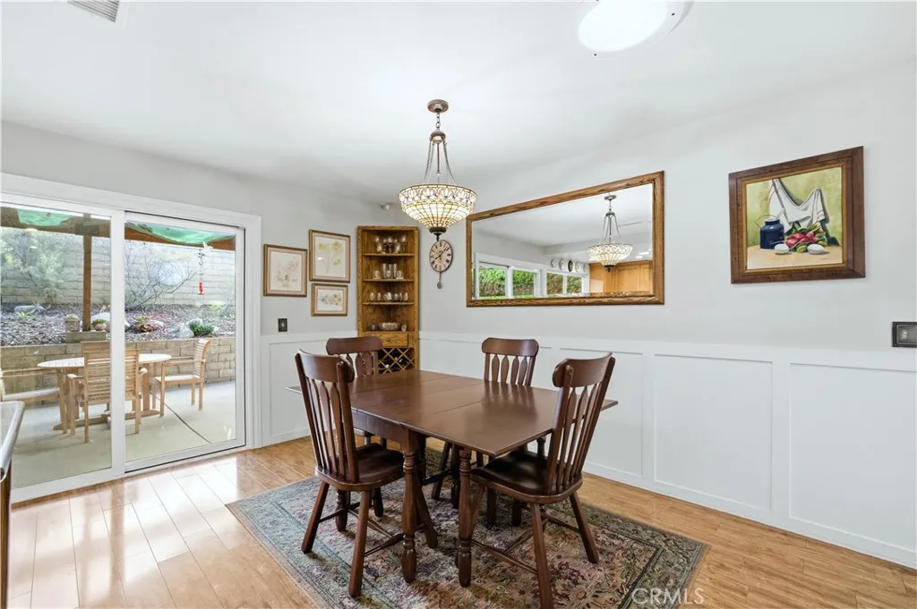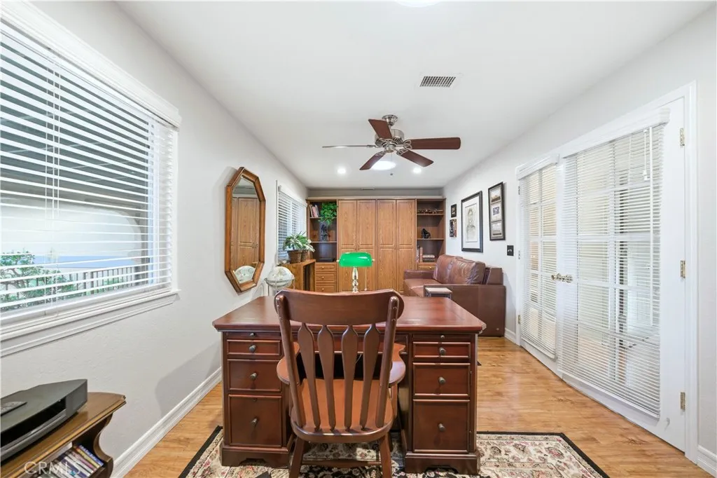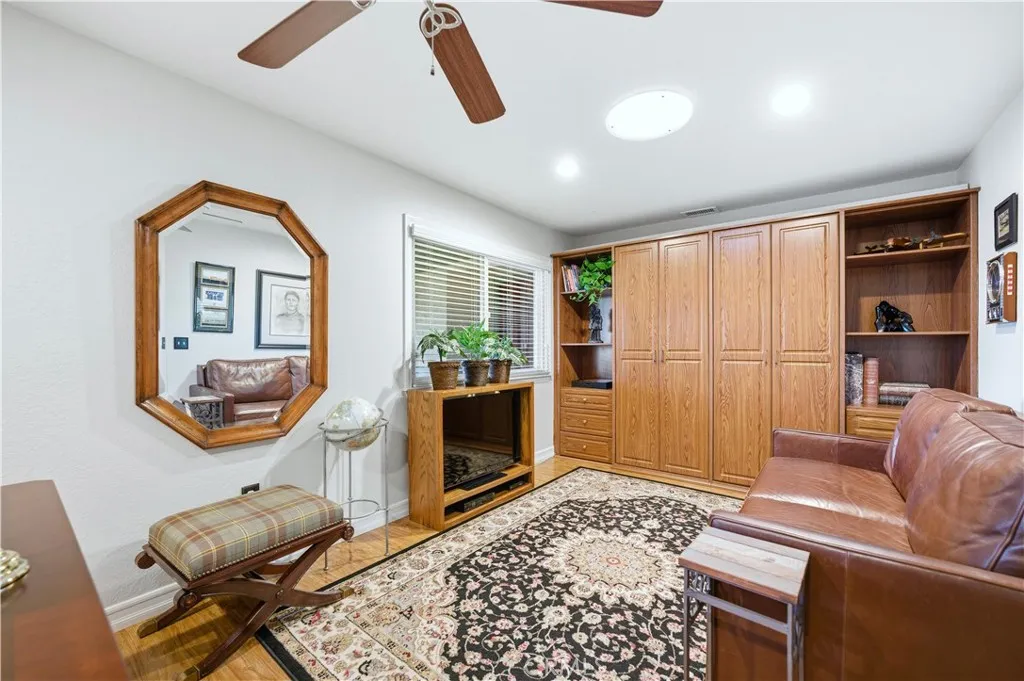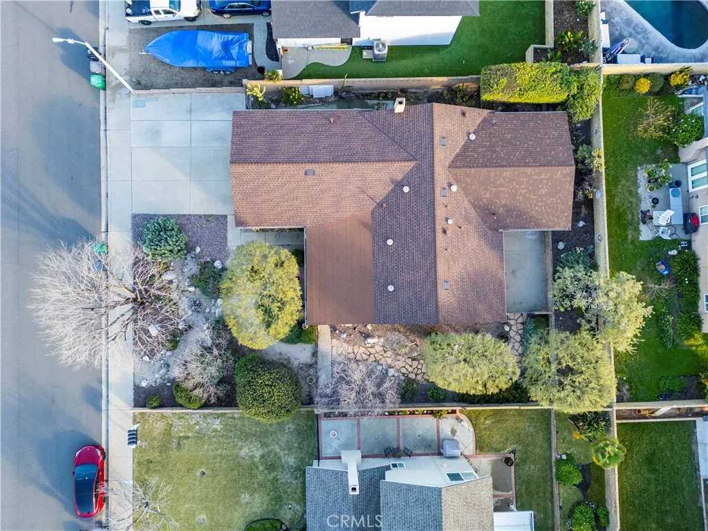This single-story residence offers approximately 1,340 sq ft of living space on a 7,651 sq ft lot with an open floor plan and defined indooroutdoor flow. The living room features a fireplace, vaulted ceiling, recessed lighting, opening directly to the kitchen and dining area. The kitchen includes a center island, stone countertops, full-height cabinetry, gas range, dishwasher, and a sliding glass door leading to the backyard. The primary bedroom includes double-door entry, mirrored closet doors, ceiling fan, and a private three-quarter bathroom with walk-in shower. A second bedroom with French doors offers flexible use as a bedroom, office, or den or can be converted to create a 3rd bedroom. A full hall bathroom features a tub/shower combination, stone vanity, and updated fixtures. An individual interior laundry room provides cabinetry, shelving, side-by-side washer and dryer space, and natural light. Additional features include central air conditioning, dual-pane windows, skylights, wood-style flooring, and neutral interior finishes. Outdoor amenities include a large covered patio with wood-beam construction, ceiling fans, and a concrete slab suitable for dining and seating. The backyard is enclosed by block wall fencing and features raised planters, stone retaining walls, garden pathways, and drought-friendly landscaping. Side yard access includes a gated area suitable for additional vehicle, boat, or recreational parking. The property includes a two-car attached garage with direct access and a full driveway. Conveniently located near parks, shopping, dining, and major tr