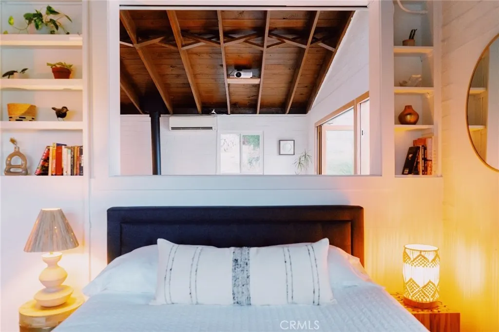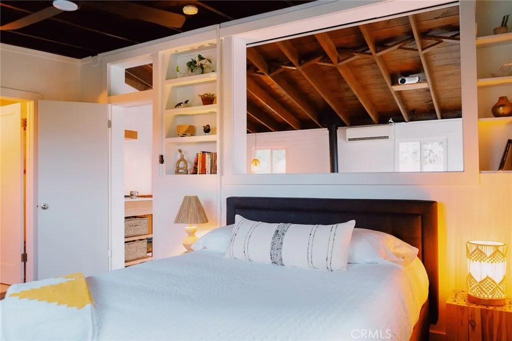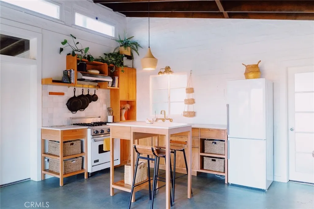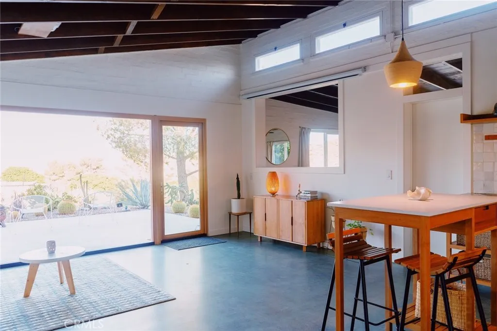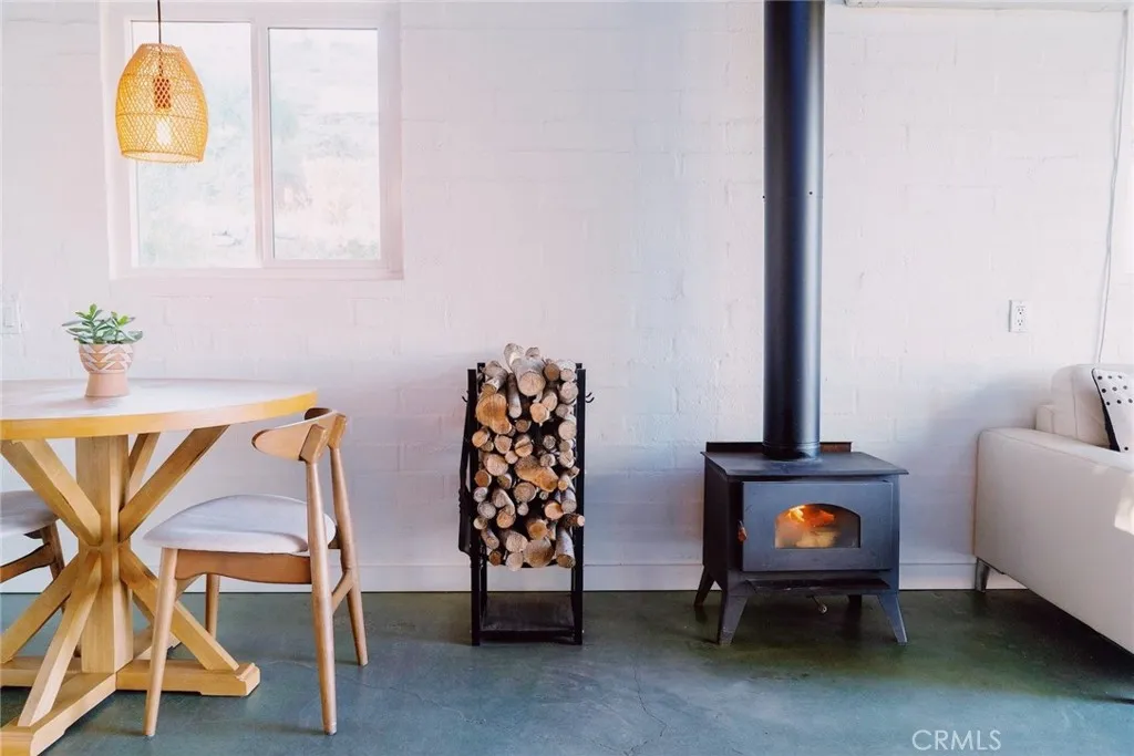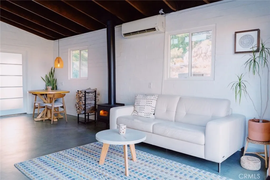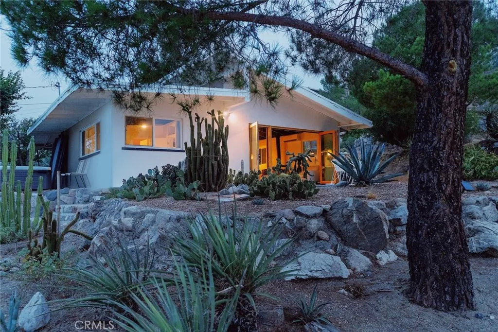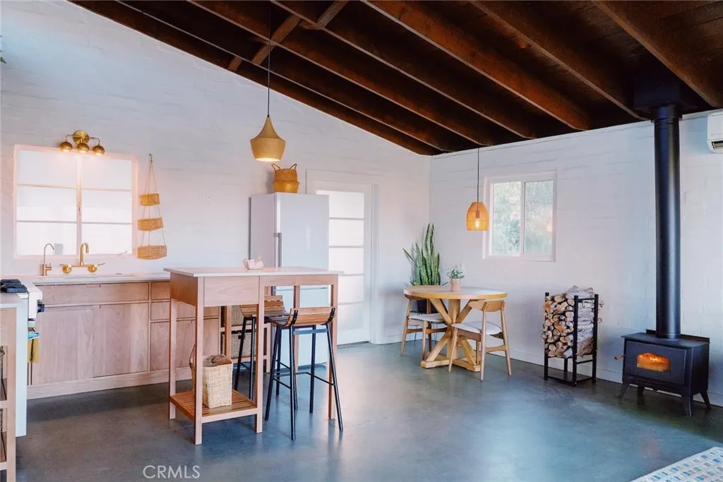***BEAUTIFULLY REMODELED MID-CENTURY GEM*** This 1950-built mid-century bungalow has been beautifully restored and remodeled with custom designer finishes and amenities. Nestled up against a hillside, the glass wall of the great room features custom La Cantina bifold doors that open the whole house up to a serene mature cactus garden with epic long views of layered mountains. Inside is a wood-burning stove that provides both heat and ambience. A new mini split unit provides additional heat and air conditioning for year-round comfort. The designer kitchen features custom cherry wood cabinetry by local designer Fire on the Mesa, a hidden Fisher Paykel dishwasher drawer, a filtered water system, and a gas Viking range. The polished concrete floors stretch throughout the kitchen and great room areas. The vaulted wooden beamed ceiling covers the entire space, and add to the open and relaxing feeling of the naturally lit interior. The bedroom also features view windows and provides a quiet comfortable space for sleeping. The bathroom includes a tiled shower and beautiful custom cabinetry as well as a concrete sink crafted by a local designer. There is a bonus room along the backside of the home provides extra living space, and could be used for a second bedroom or office, as well as new laundry facilities that are easy to access but out of view. The detached garage has been upgraded, insulated, and finished inside for use as a studio, recreation space, or as a two-car garage. This dreamy hideaway is well located on a quiet paved road and has easy access to local amenities, and is