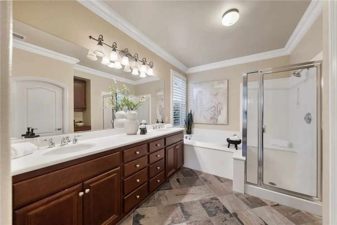 Welcome to Four Seasons, Hemets premier 55+ active adult community offering resort style living surrounded by scenic hills and golf course views. The main home features three bedrooms and two full baths, and the property also includes an attached Casita with its own separate exterior entrance, providing an ideal fourth bedroom + Bath for multi generational living or office space. Inside, the main living spaces offer hardwood floors, crown molding, shutters and recessed lighting. The kitchen includes granite countertops, ample cabinetry and a comfortable layout that opens to the living area. The living room features a custom built in and a warm fireplace, creating an inviting space to relax or entertain. A separate laundry room with a sink and additional storage adds everyday convenience. The backyard is designed for privacy and comfort with a spa and a custom fire pit overlooking the surrounding hills and portions of the golf course. Residents of Four Seasons enjoy an impressive list of amenities including a junior Olympic community pool, a year-round heated spa, clubhouse, ballroom, fitness center with treadmills and ellipticals and a game room. This vibrant community provides an active lifestyle with beautifully maintained grounds and a welcoming atmosphere. Experience resort style living in one of Hemets most desirable 55+ neighborhoods. This home combines comfort, style and exceptional amenities in a peaceful golf course setting.