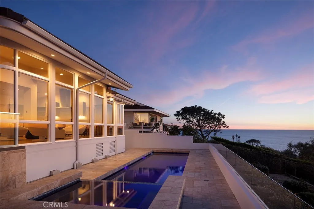 Sited at the very end of North Portola, this custom home sits at the end of a shared drive which leads to a large privately gated paver-lined motor-court. A large steel and glass entry door opens towards the ocean, offering a substantial view of The Pacific upon entry. A great room with soaring ceilings is lined with bleached oak flooring across the open concept living spaces with some of the very best views in Lower Three Arch Bay from nearly everywhere in the home. A chefs kitchen offers an oversized kitchen island with large built-in breakfast area, natural stone countertops, a stainless steel appliance suite with six burner stove, a walk-in pantry, an ice maker, and dramatic vistas up the coastline. Two of the four bedroom suites are on the main level, each offering a private bathroom. One of the two offers ocean views and separate access from a private patio with waterfall fountain. Two additional bedrooms are located on the second level, each accessed by separate private stairways. The primary suite includes a view terrace as well as a spa-like bathroom with a freestanding soaking tub illuminated by an overhead skylight, a walk-in shower, and a large walk-in closet. A secondary private suite accessed by a window-lined architectural stairway offers two separate terraces, including one with ocean views, as well as a walk-in closet. A Pebbletec pool & spa with limestone tiled pool deck on the view-side of the home offers outstanding sun exposure and has unmatched views of the Laguna Beach Coastline, Catalina Island, year-round sunsets, and beyond.