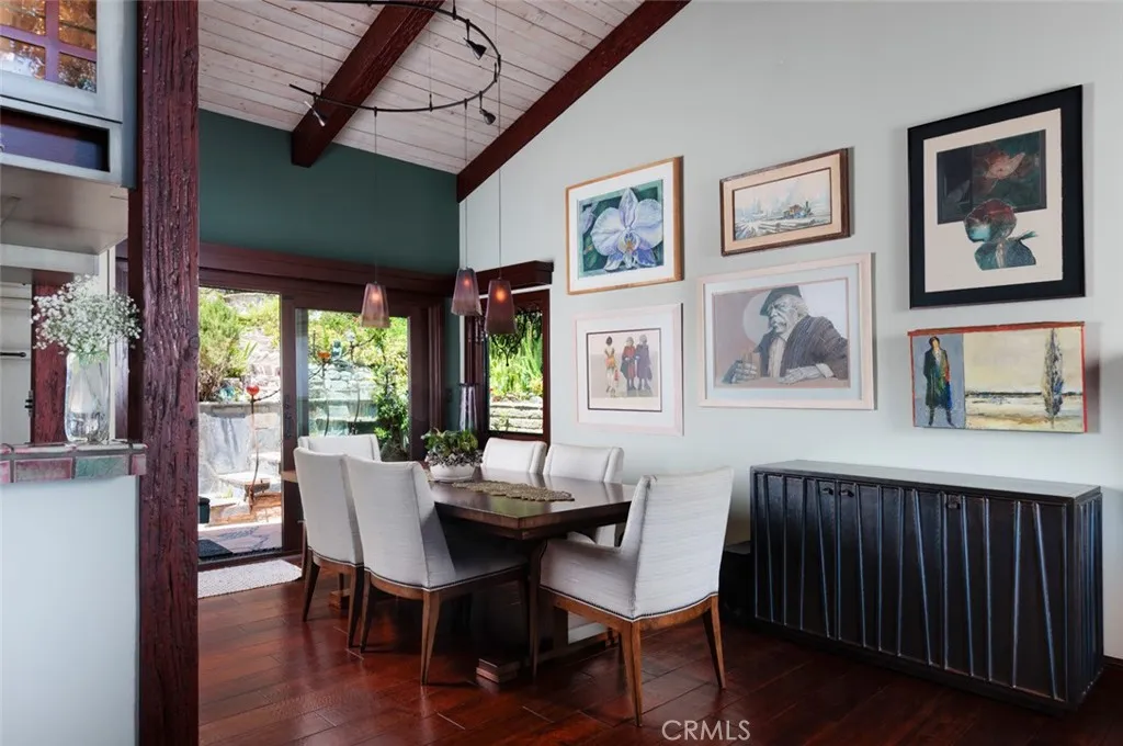 Tucked along one of North Laguna Beachs most picturesque streets, 530 High Drive is a study in thoughtful design, timeless materials, and bespoke coastal charm. With sweeping ocean and Catalina Island views from nearly every roomand a garden landscape that feels curated rather than plantedthis coastal residence balances architectural integrity with relaxed elegance, all while presenting an exceptional opportunity for future expansion. The homes exteriora patchwork of earth-toned shingles, copper accents, custom handmade fixtures by local artisans, and lush botanicalshints at what lies within: a series of warm, light-filled rooms where craftsmanship takes center stage. Vaulted, beamed ceilings and real hardwood floors lend a sense of quiet luxury, while walls of windows draw the eye toward the Pacific. At the heart of the home, a gracious living room is anchored by a Franklin stove wood-burning fireplace and opens through sliding glass doors to a large ocean-facing deck designed for sunset viewing and outdoor entertaining. The adjacent kitchen is both refined and personal, featuring custom cabinetry and copper detailing. The private primary suite is tucked into the rear of the home and enjoys tranquil garden vistas, while a west-facing secondary bedroom captures cinematic sunsets and features a cozy loft spaceperfect for guests or creative retreat. A lower-level bonus room with office area offers versatile utility, easily adaptable as a studio or gym. An attached two-car garage with direct interior accessa true rarity in Laguna Beachadds both convenience and additional stora
