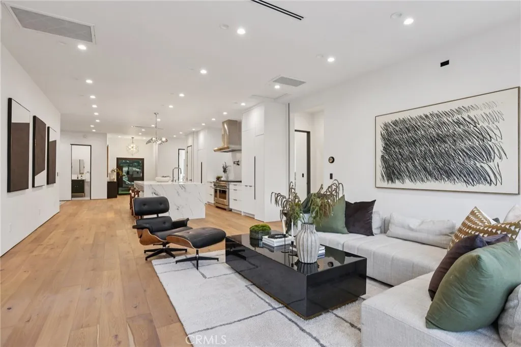 High in the Upper Hollywood Riviera, The Light House, a Riviosa Signature Home, isnt just another new build, its a vibe, a wink, and a wildly refreshing reminder that homes can still surprise you when every detail actually matters. Step through the custom iron-and-glass front door and it hits immediately: this place was designed for someone who wants different, who notices the little things, who appreciates intention over imitation. With more than 250 recessed LEDs giving it an unmistakable glow, the home leans into its name... light as clarity, creativity, and that moment when an idea becomes something real. The great room stretches wide and bright, grounded by warm teak wide-plank floors and opened completely to the backyard through wall-to-wall bi-fold doors that let in sunshine, breezes, and a whole lot of possibility. Just beyond, the chefs kitchen shows off with Sub-Zero refrigeration, a full wine fridge, a Fisher & Paykel dual-oven range with griddle, pot filler, apron-front stainless sink, polished nickel Kohler faucet, and a 10-foot island with pop-up wireless chargers that feel like tiny party tricks. Flowing naturally into a full-size dining area, the whole space becomes an invitation to linger... holiday feasts, Tuesday takeout, and everything in between. In the living area, a 150-inch retractable screen drops from above like its making an entrance, aligned so you can watch from the sofa or out on the patio, turning Sundays and movie nights into full-blown indooroutdoor events. The backyard keeps the energy going with three intentional zones: a dining area for l