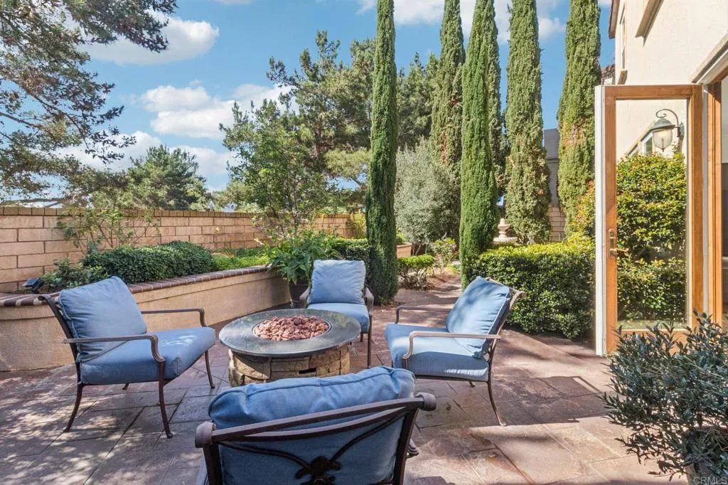 Rare opportunity in sought-after Pacific Highlands Ranch. This exceptional 5-bedroom, 3-bath home is move-in ready and beautifully upgraded. The main level features formal living and dining rooms, plus a guest bedroom with a full bath. Recently updated gourmet kitchen with quartz countertops, oversized island, and stainless steel appliances flows seamlessly into a large family room, featuring a gas fireplace and built-in surround sound. Upstairs, the spacious primary suite showcases western views through an oversized window, a spa-like bath with a soaking tub, dual vanities, a marble-tiled shower, and a custom walk-in closet. Also on the upper level are three additional bedrooms, a secondary bathroom, and a laundry. Two of the bedrooms include walk-in closets, while the largest features a built-in desk and shelving, perfect for a home office. The house is filled with quality upgrades, including a 6.8 kW roof-mount solar system, Bosch dual-zone HVAC with smart thermostats, real walnut hardwood and tile flooring, fresh interior paint, and elegant draperies. An inviting backyard offers a cozy sitting area, perfect for relaxation and casual entertaining. A manicured rose garden and a heavy-bearing apple tree are surrounded by towering mature cypress trees on both sides, creating privacy. The three-car garage features epoxy flooring and plentiful overhead storage. Conveniently located just minutes from top-rated CV schools, West Highlands Pacific Rec Center, and The Village at Pacific Highlands Ranch.